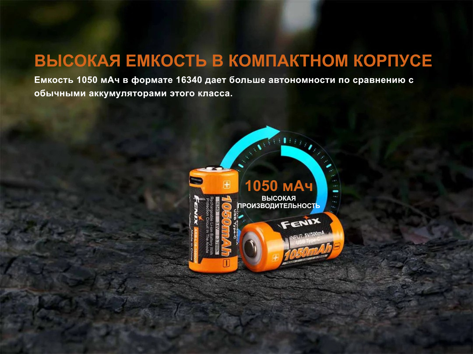 Описание аккумулятора 16340 Fenix (1050 mAh) Type-C: