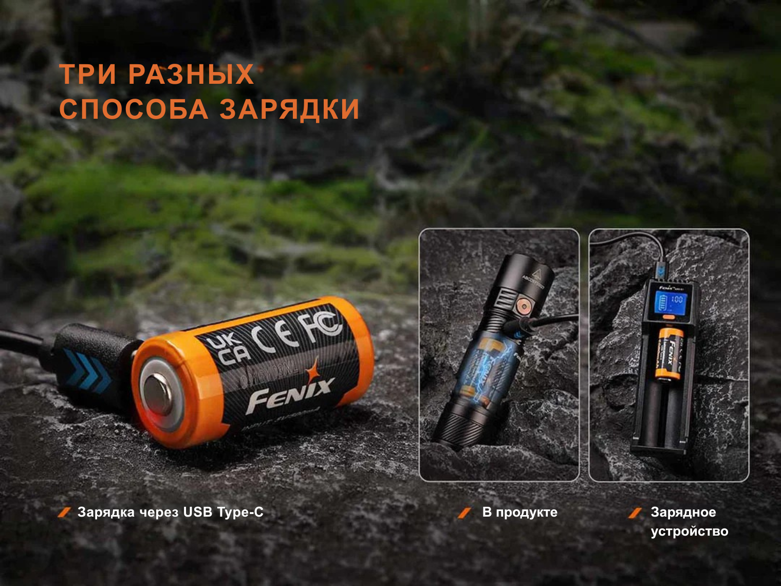 Помимо зарядки через USB-порт, аккумулятор можно заряжать в фирменных станциях Fenix серии ARE (модели D1, D2, A2, A4) или в универсальных зарядных устройствах для Li-ion батарей.