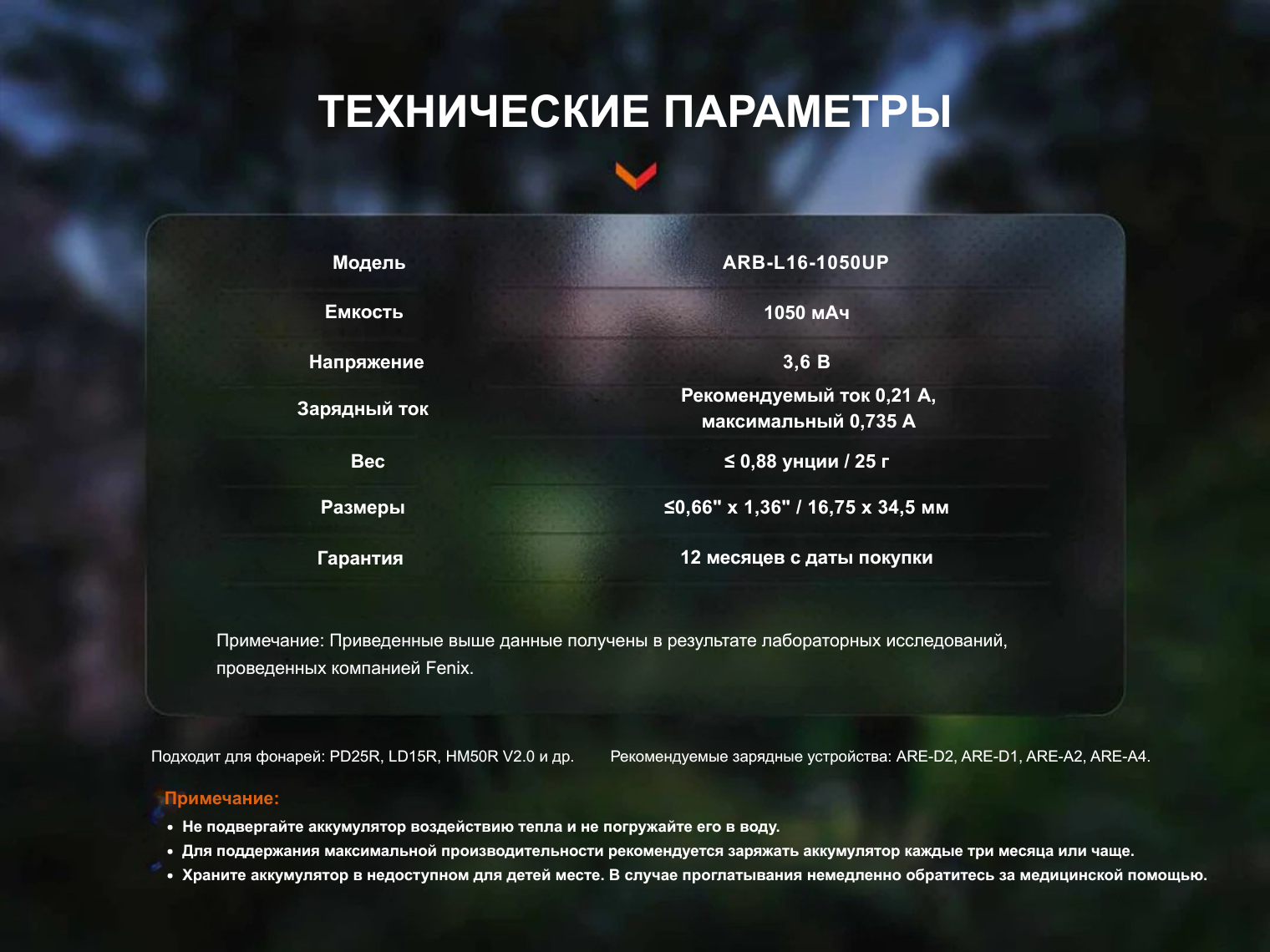Модель Fenix ARB-L16-1050UP разработана специально для использования в современных компактных фонарях, требующих высокой токоотдачи и стабильного напряжения. Аккумулятор идеально подходит для налобных фонарей (HM50R V2.0) и компактных ручных моделей (PD25R, LD15R), а также совместим со всей линейкой устройств Fenix, рассчитанных на типоразмер 16340.