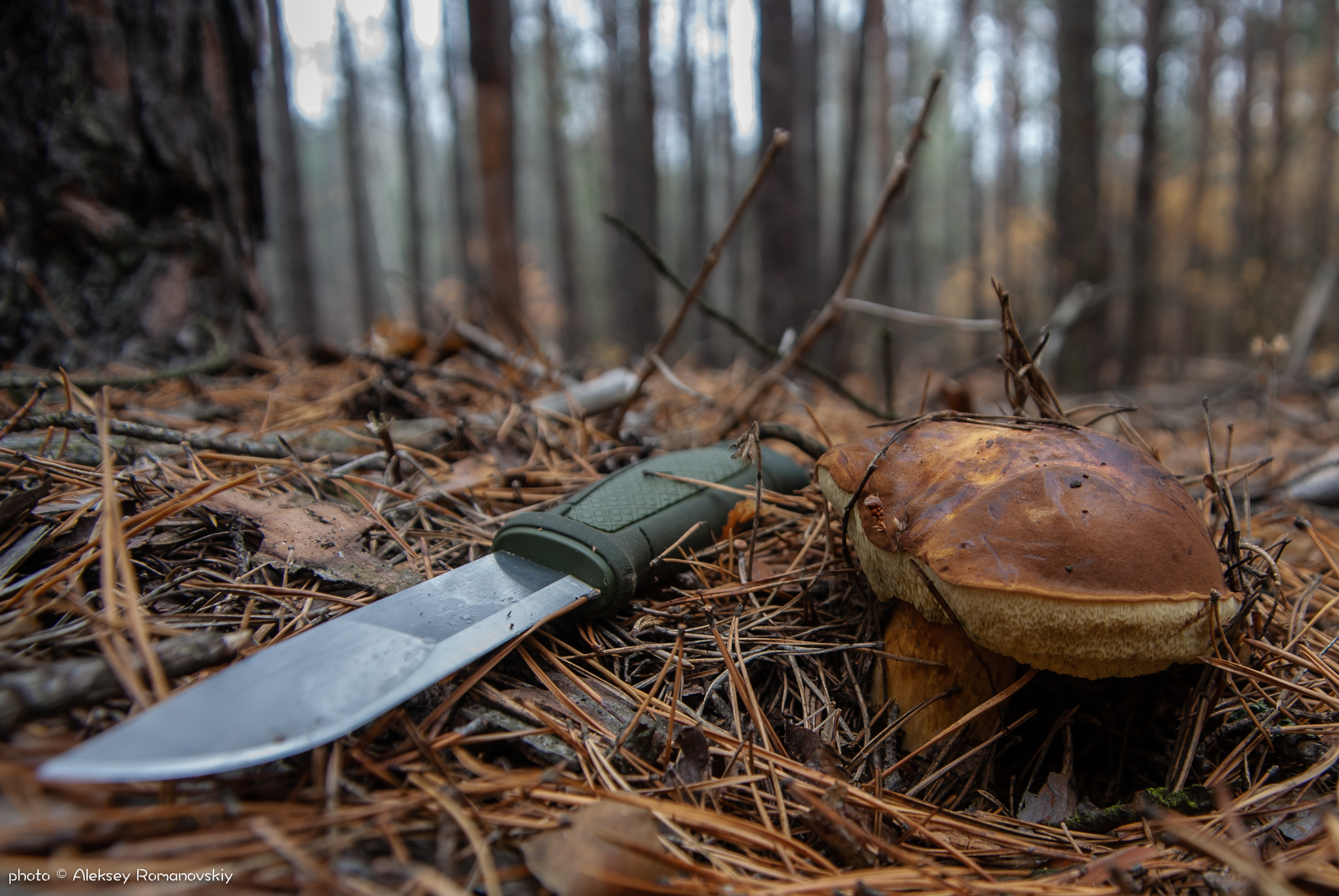 В поездке по грибным местам на велосипеде, пробовал крепить нож на лямке рюкзака “головой вниз” - очень удобно. И здесь же пригодился не полированный обушок, им удобно очистить ножку гриба, оставляя чистой кромку.
