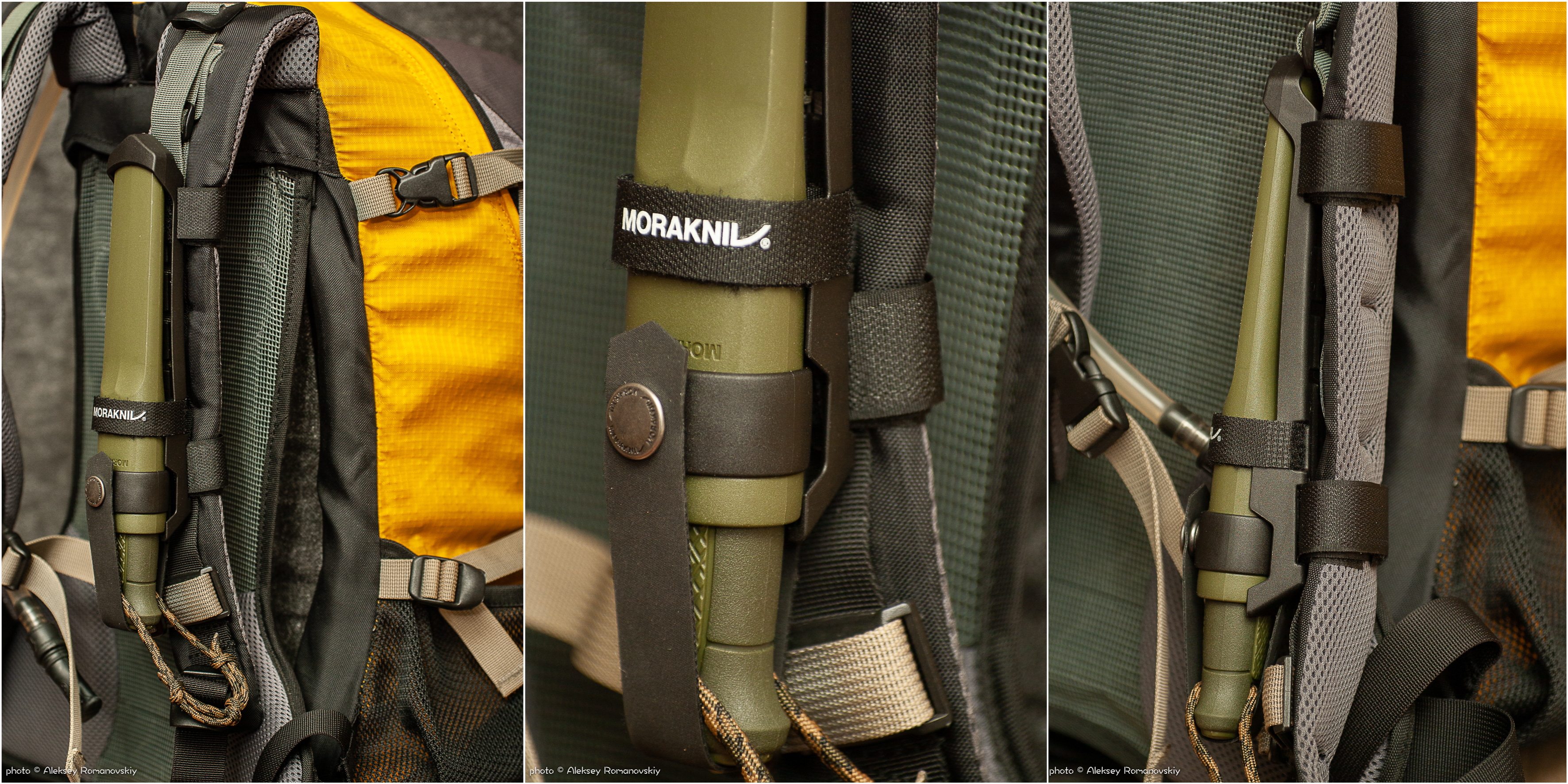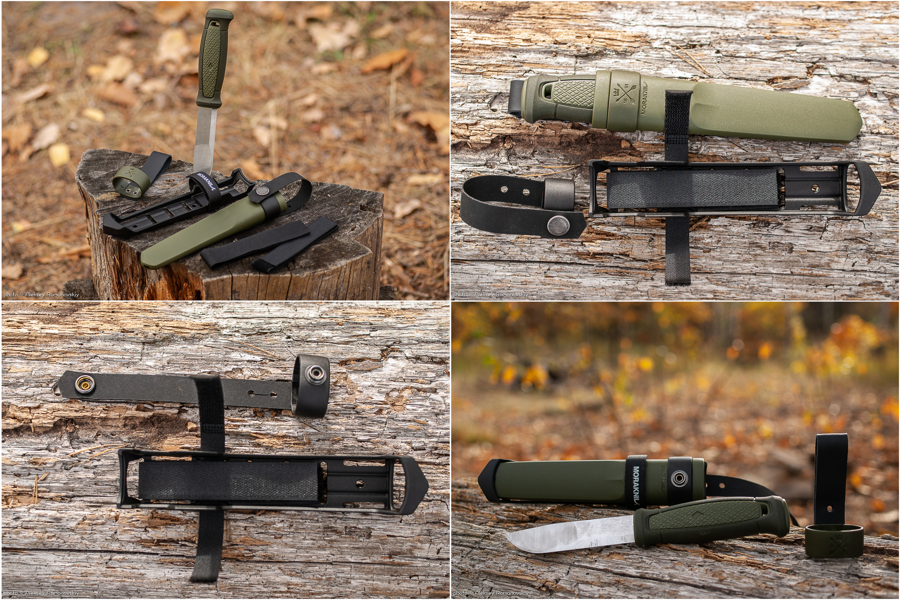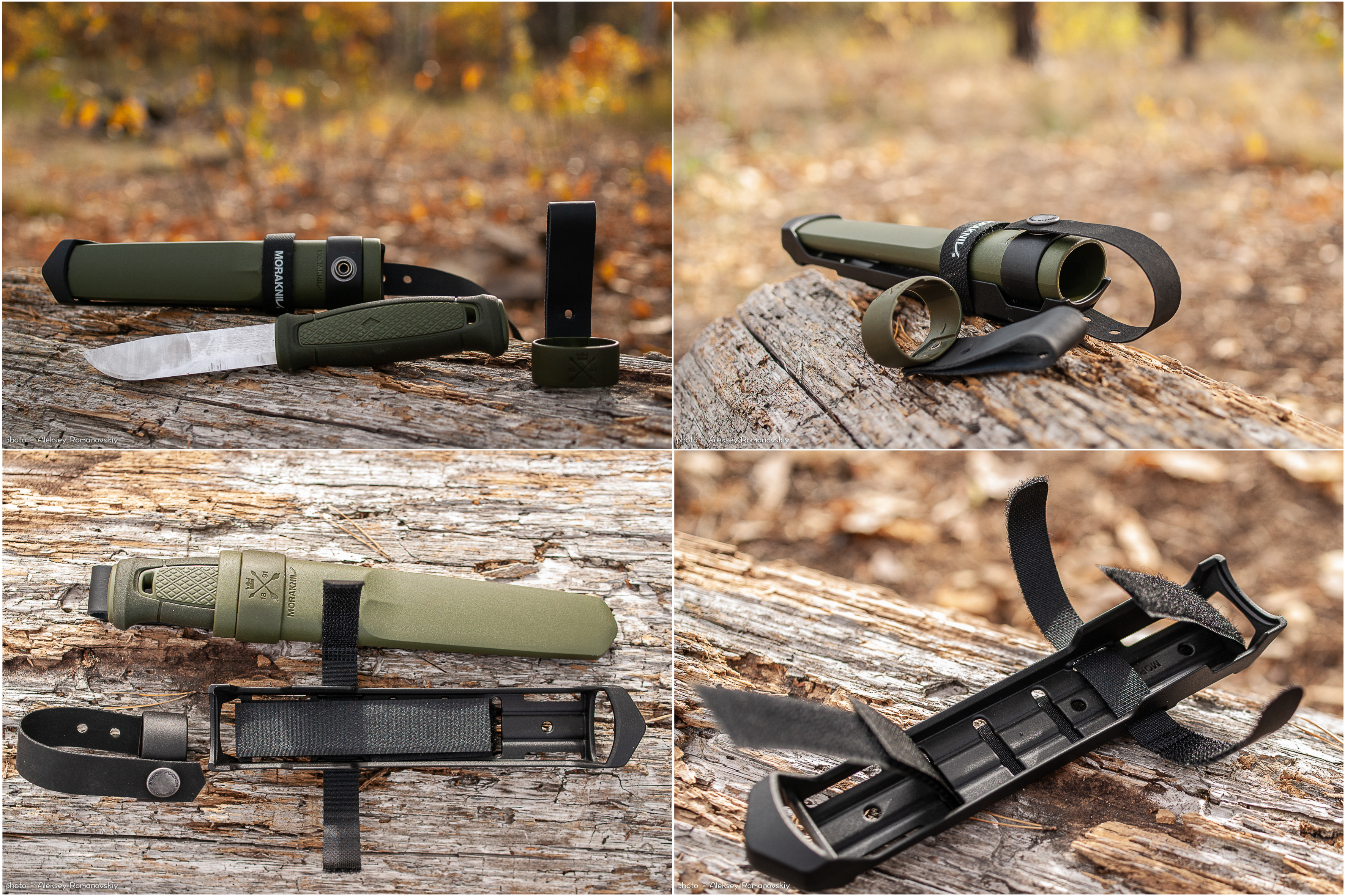 Конструкция такова, что если вам понадобится спрятать нож то вам нет необходимости снимать Multi-Mount, достаточно расстегнуть страховочную “липучку”с логотипом MORAKNIV, ремешок - всё , нож с ножнами у вас в руках.