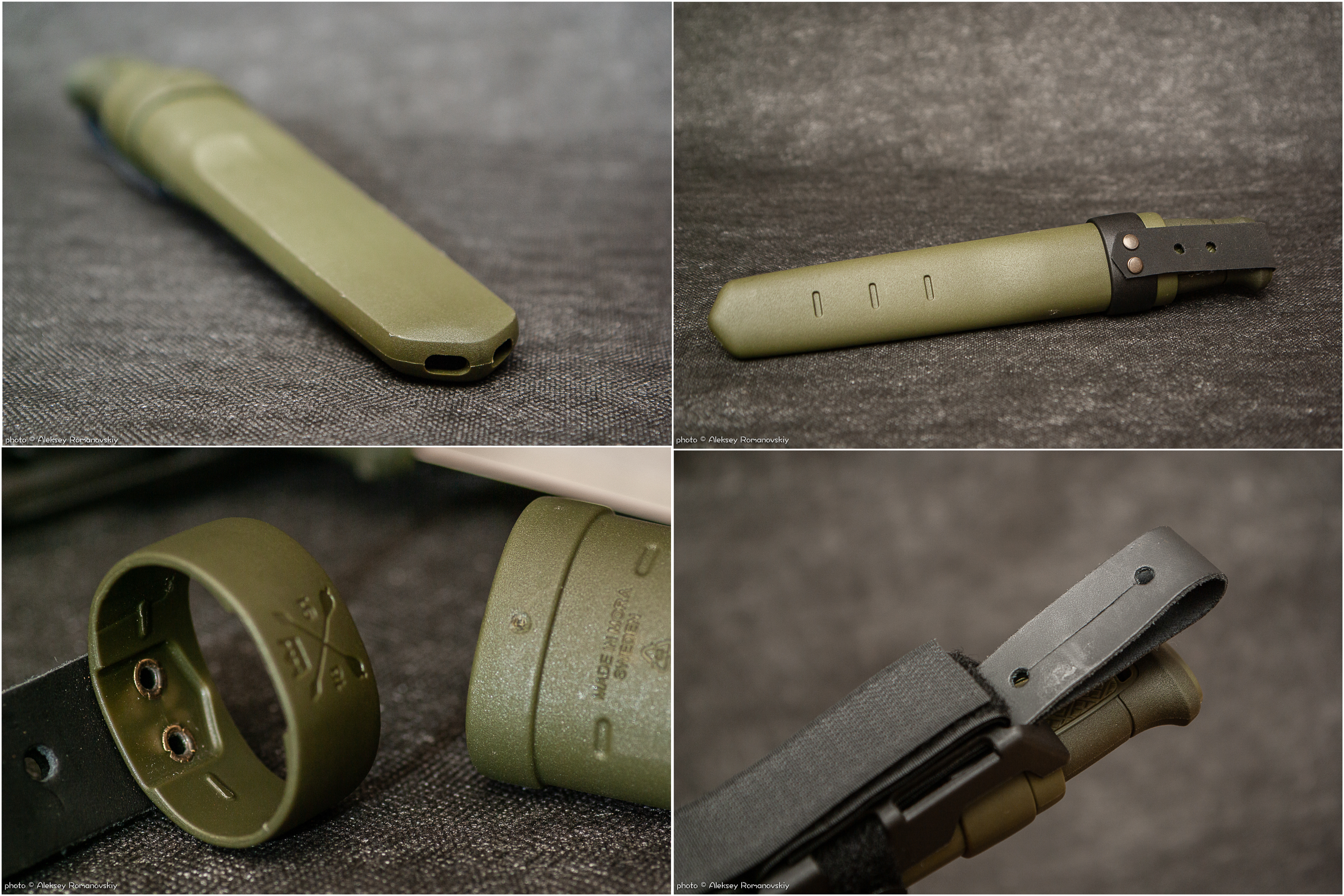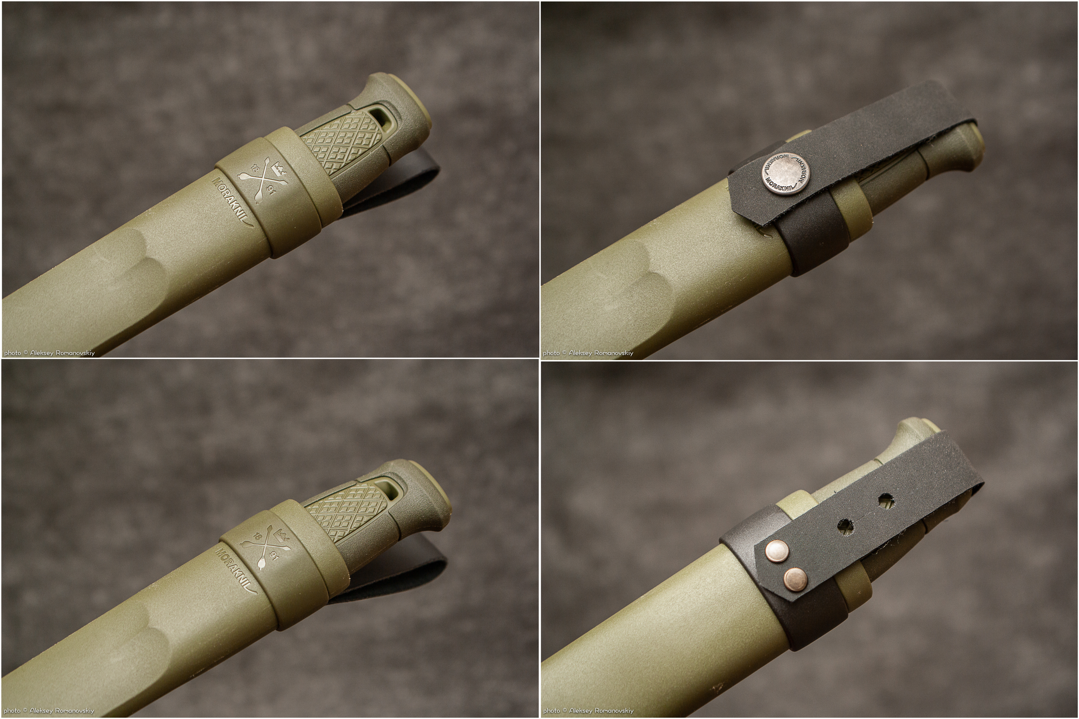 Поясная петля и страховочный ремешок крепятся к кольцам двумя латунными заклёпками. Все прочно и надёжно. На ножнах с тыльной стороны есть три горизонтальных выемки, с поставляемым комплектом они никак не связаны и не согласуются, возможно в дальнейшем комплект будет ещё расширен аксессуарами.