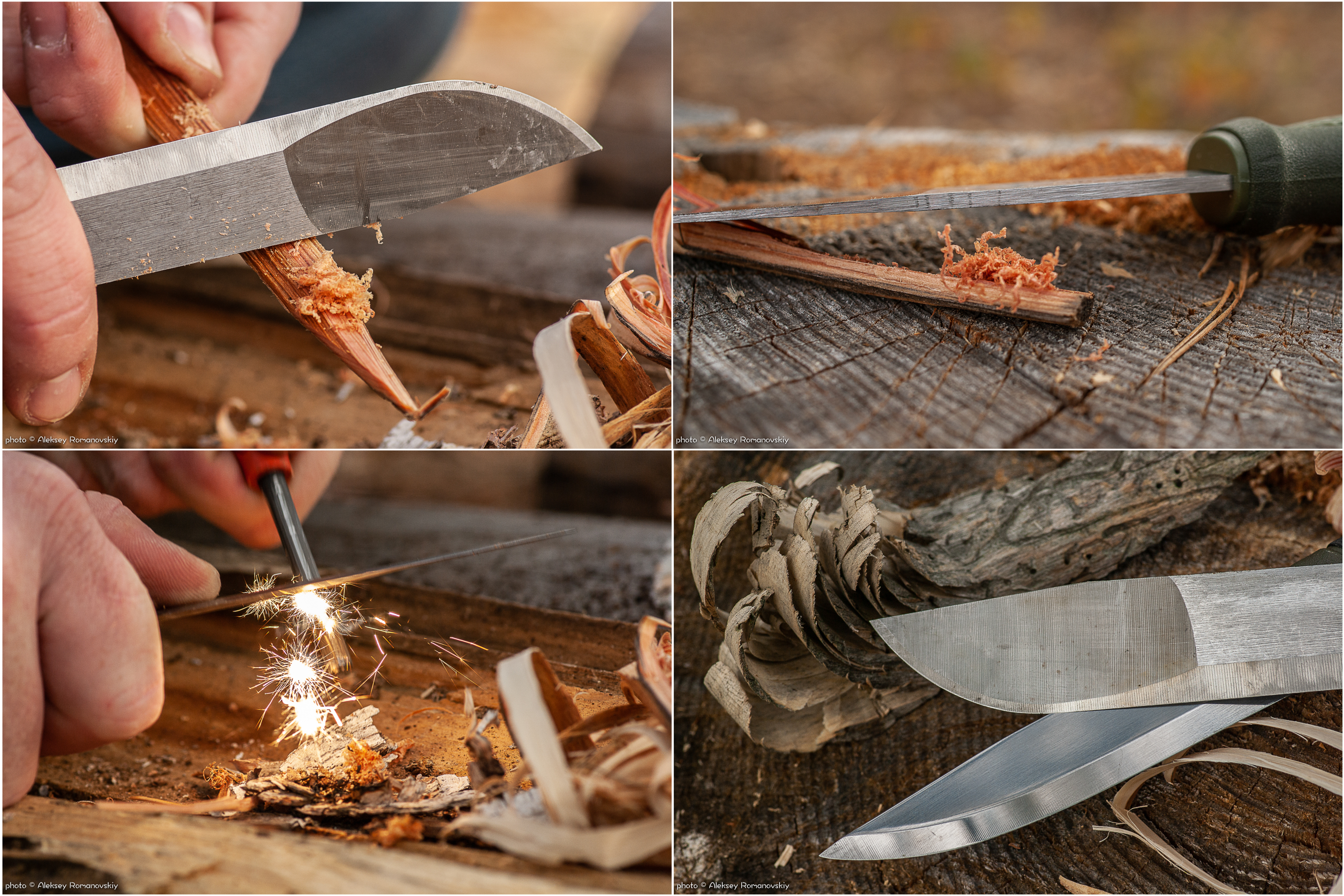 Нож за неделю в пользовании уже попробовал почти всё, "постругали" им и высушенную иргу, и просмоленный высушенный сук вековой сосны, и то и другое твёрдые как кость, порезали фрукты-овощи,сходили по грибы. Поскоблили обухом и сушняк и огниво при розжиге костра, всё удобно, результативно.