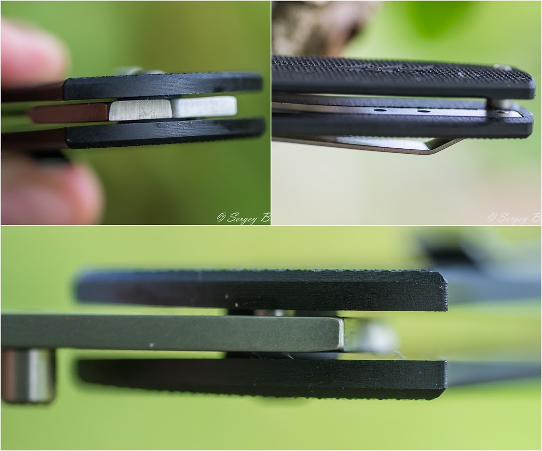 Сам нож при первом знакомстве удивляет ухватистостью рукояти и легкостью. Вес ножа 82 грамма достигается за счет облегчения рукоятей - стальных плашек здесь нету. Рукоять представляет из себя 2 плашки из G10 к одной из них привинчена 2 винтами пружина замка liner-lock, и к этой же пружине привинчена клипса. Жесткость рукояти средняя - при сильном сжимании в руке плашки играют. Клипса имеет только одно положение, длина ее достсточно большая, конечно при наличии желания ее можно разогнуть, но это маловероятно.