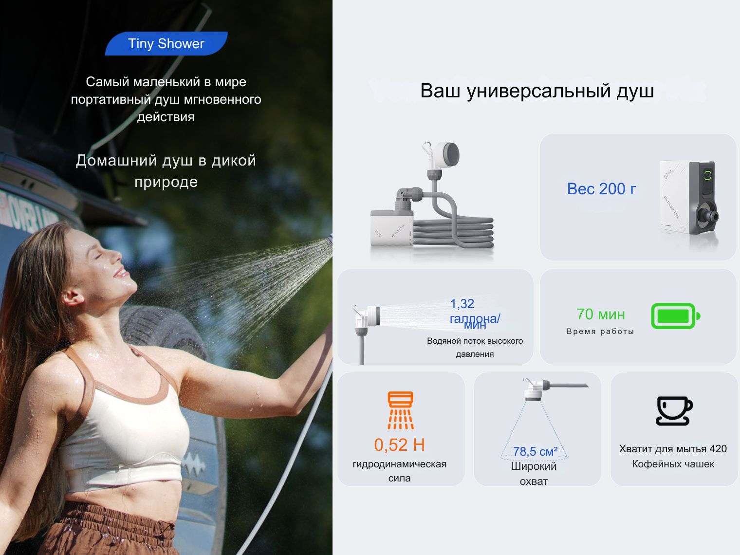 Описание душа портативного с насосом на аккумуляторе Flextail Tiny Shower, белого: