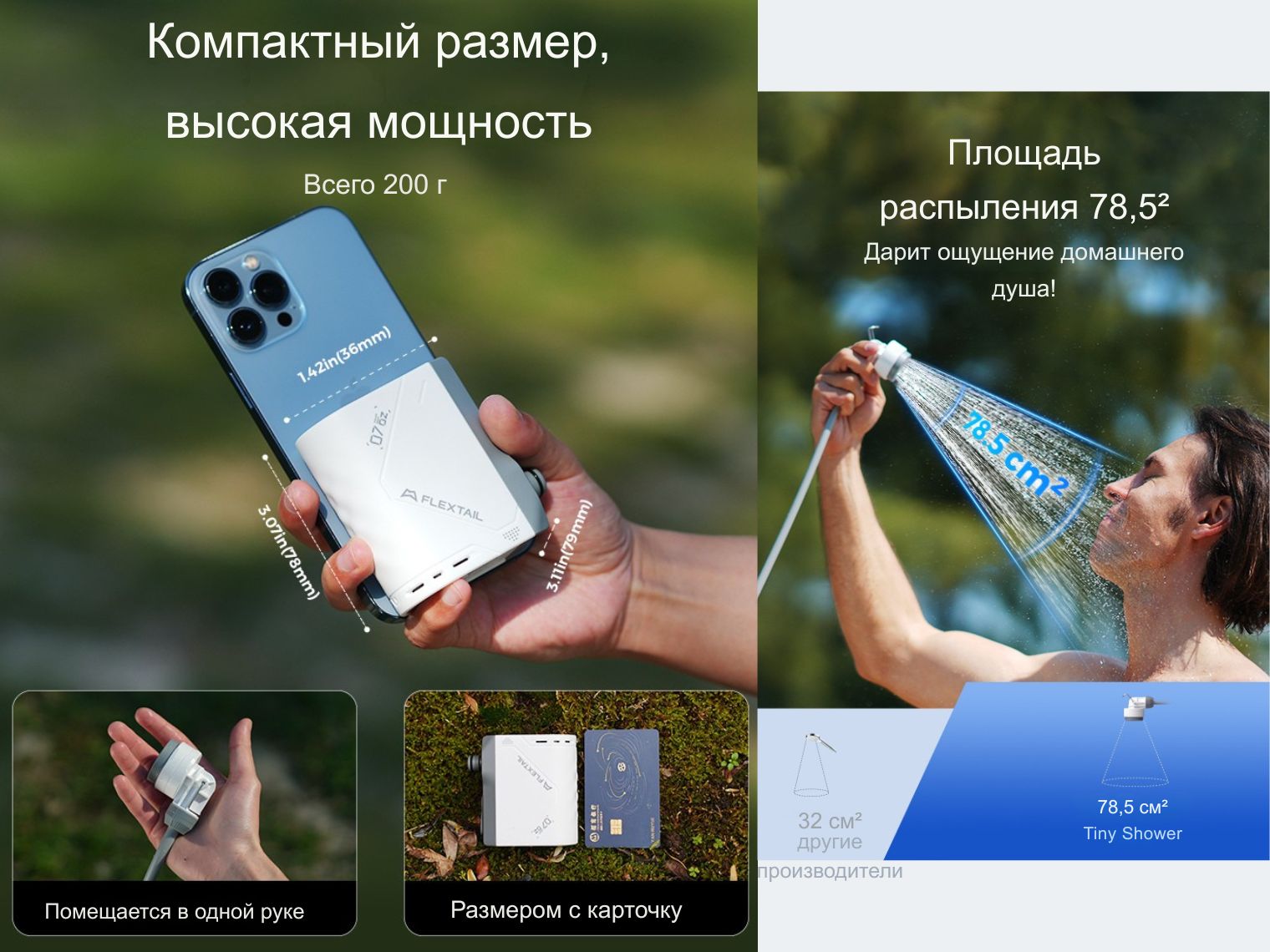 Портативная душевая система Flextail Tiny Shower — это компактное решение для поддержания гигиены и покрытия базовых потребностей на природе, в дороге или на даче. Имея такую систему и любую емкость с водой вы можете принимать полноценный душ, где бы ни находились, а также обустраивать комфорт в полевых условиях.
