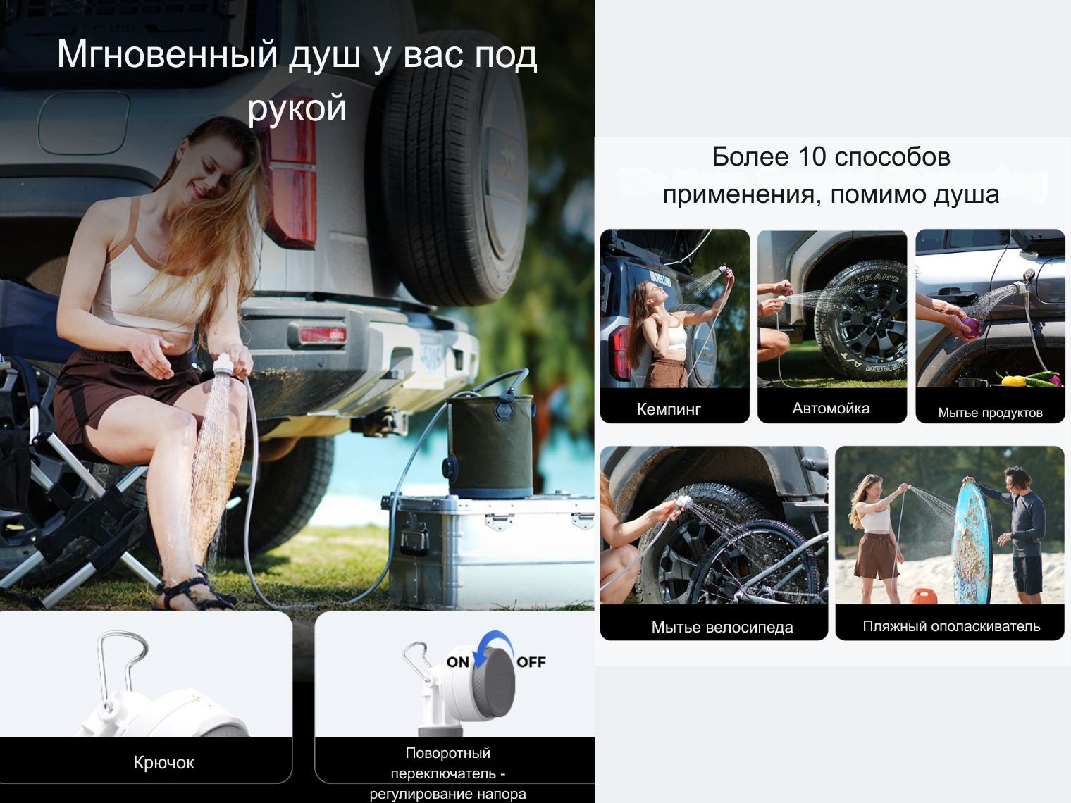 - 2 режима потока воды. Мощность режимов составляет 3.5–4 л/мин (низкий) и 4.5–5 л/мин (высокий), покрывая широкий спектр потребностей — от личной гигиены во время отдыха под открытым небом до практического применения, например, мытья колес, фруктов, посуды.