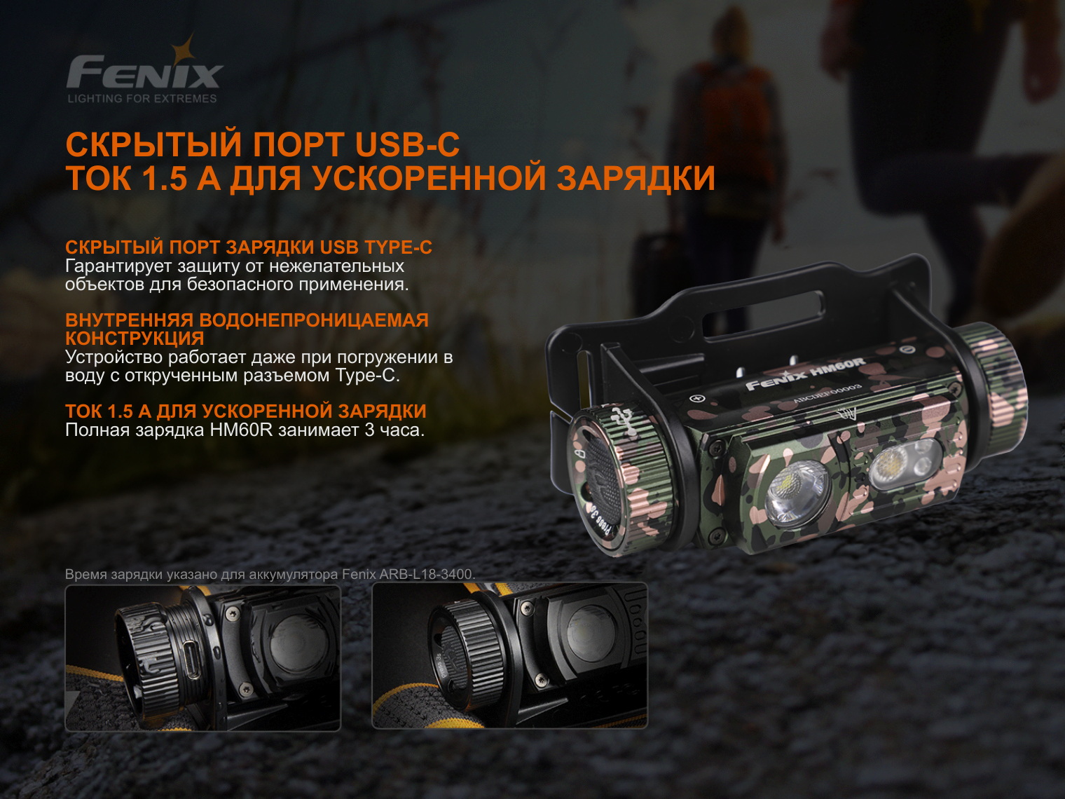 Фонарь Fenix HM60R Camo, аккумулятор ARB-L18-3400, кабель для зарядки USB Type-C, запасное уплотнительное кольцо, инструкция пользователя, гарантийный талон.