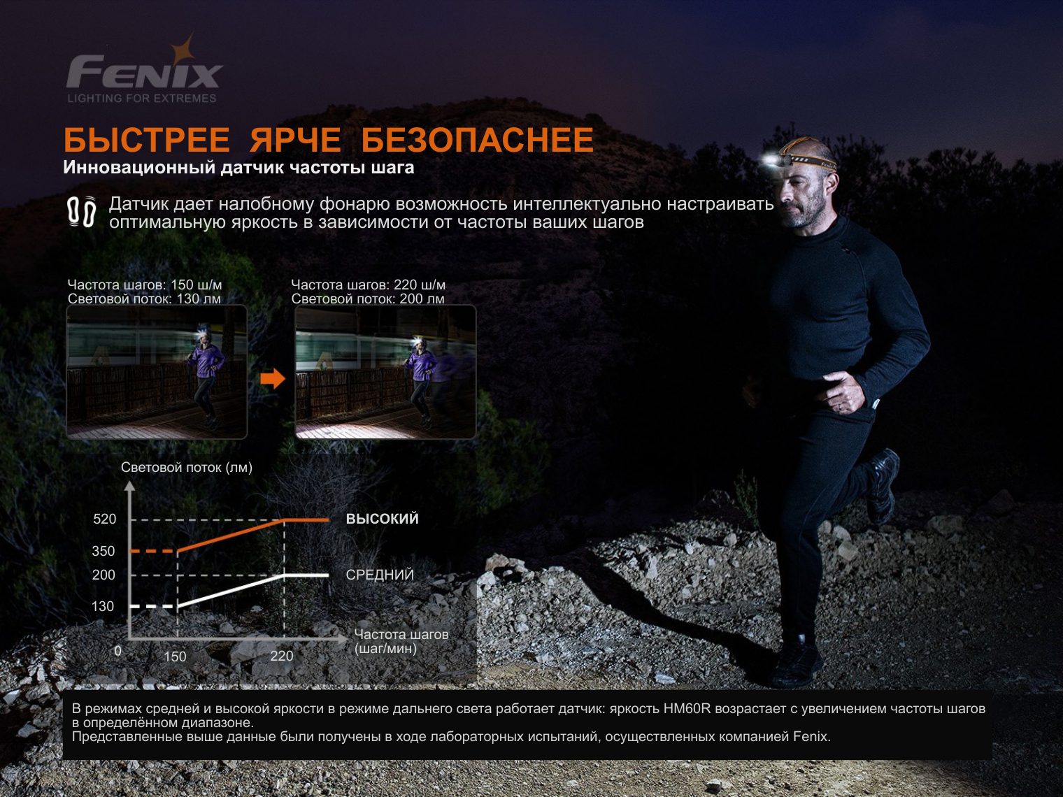 Уникальной фишкой модели является интеллектуальный сенсор частоты шага. Фонарь автоматически регулирует яркость в зависимости от темпа вашего движения в «Среднем» и «Максимальном» режимах. За стандарт принят темп 150 шагов/мин: при ускорении до 220 шаг/мин яркость возрастает до 150%, а при замедлении до 80 шаг/мин — снижается до 70%. Если темп падает, яркость уменьшается постепенно с задержкой в 10 секунд, что позволяет глазам адаптироваться к изменению освещения.