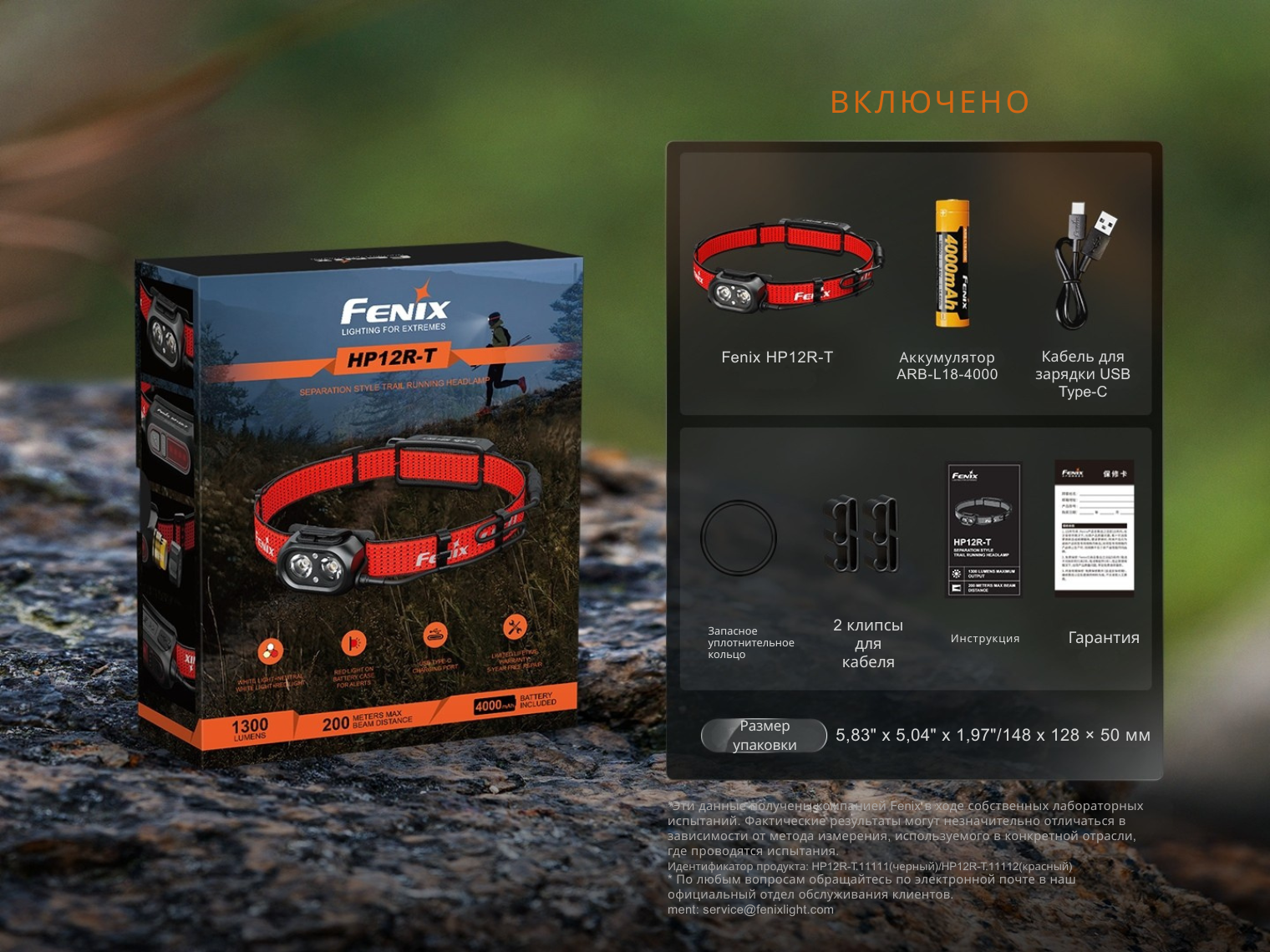 Фонарь Fenix HP12R-T, аккумулятор ARB-L18-4000, зарядный кабель USB-C, запасное уплотнительное кольцо, 2 зажима для кабеля от батарейного блока, инструкция пользователя, гарантийный талон.