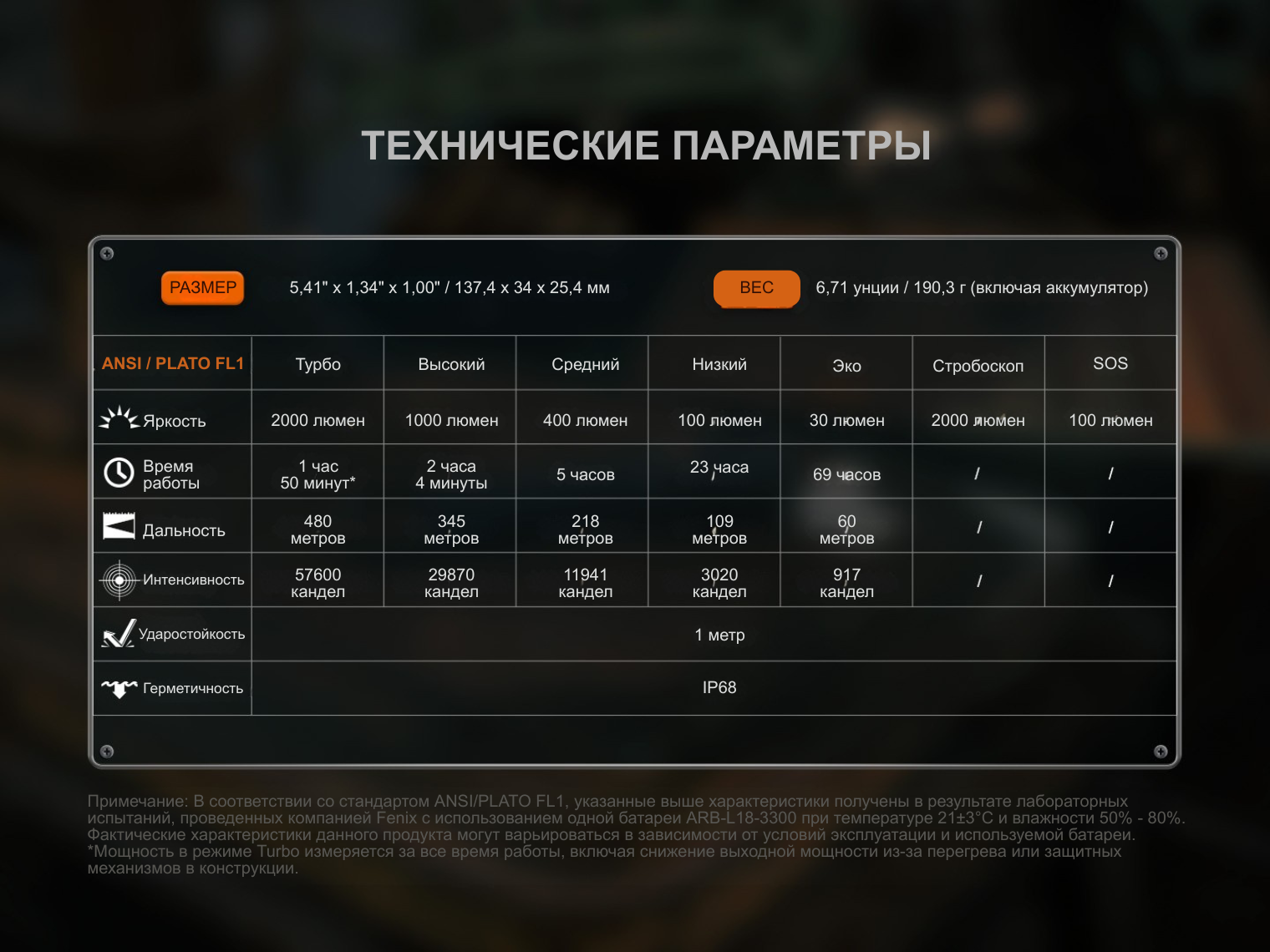 - Турбо: 2000 лм – 57600 кд – 1 ч 50 мин – 480 м;