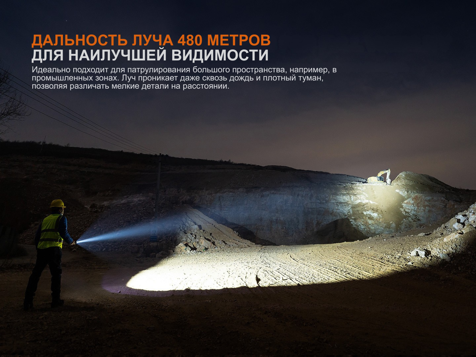 В модели установлен светодиод Luminus SFT40 Gen2 с ресурсом работы 50 000 ч. Благодаря узконаправленной оптике фонарь формирует концентрированный луч, достигающий отметки 480 метров. Это обеспечивает четкую видимость удаленных объектов при сохранении достаточной боковой засветки.
