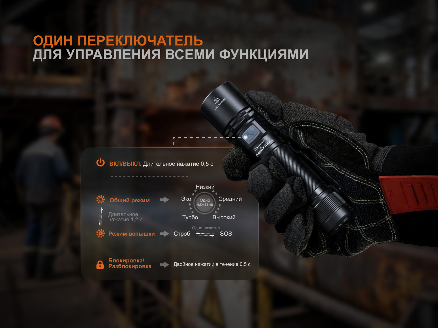 Управление всеми функциями сосредоточено в единой металлической кнопке. Она отвечает за включение (зажатие на 0.5 с), выбор яркости короткими кликами и активацию спецрежимов (зажатие на 1.2 с). Система электронной блокировки (двойное нажатие) предотвращает случайное включение при транспортировке.