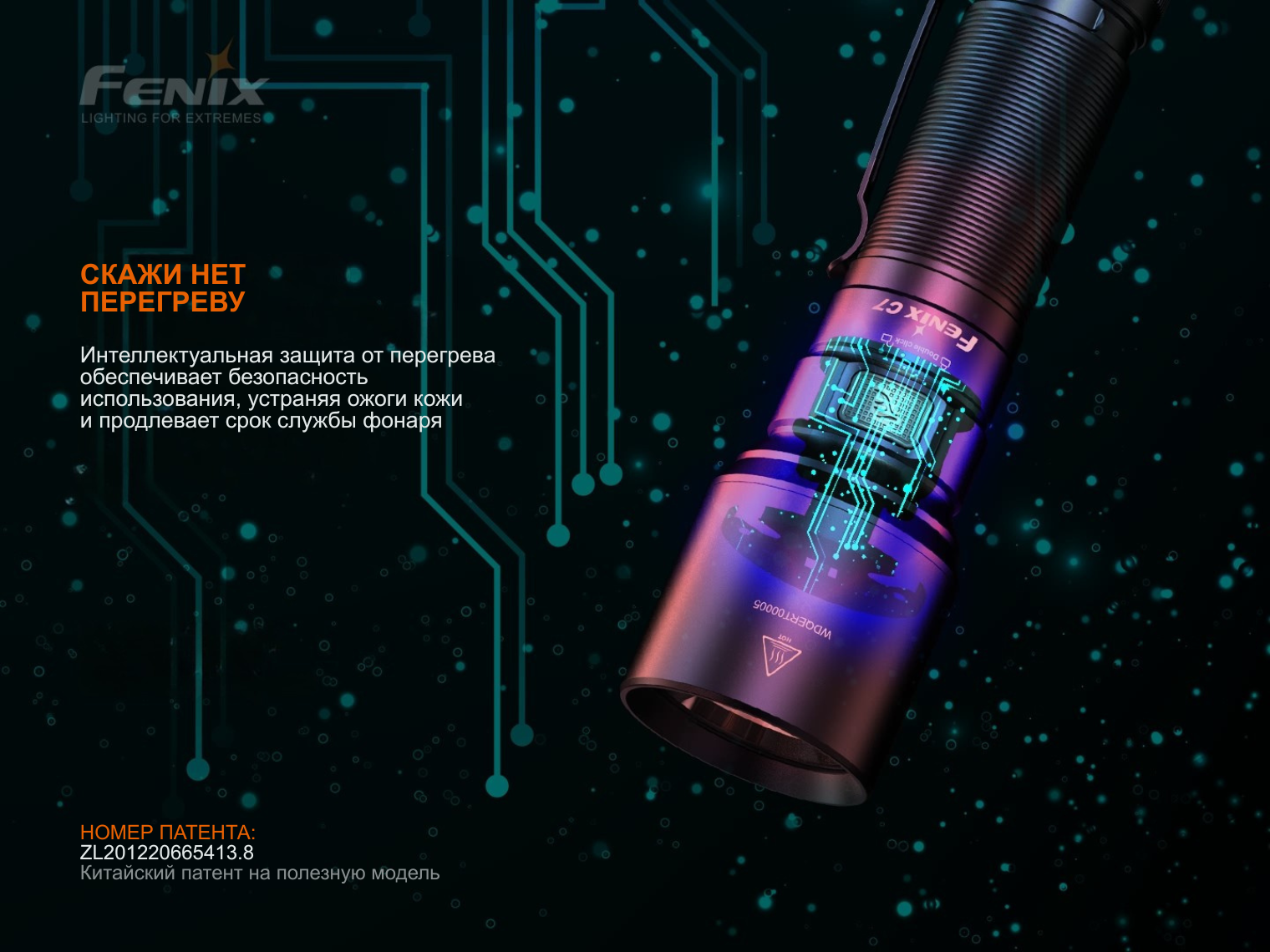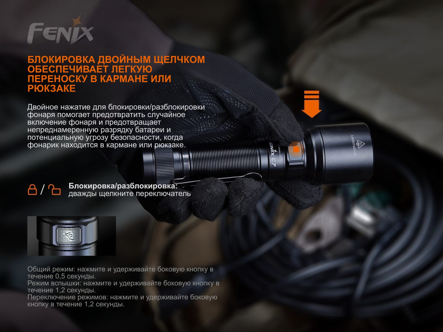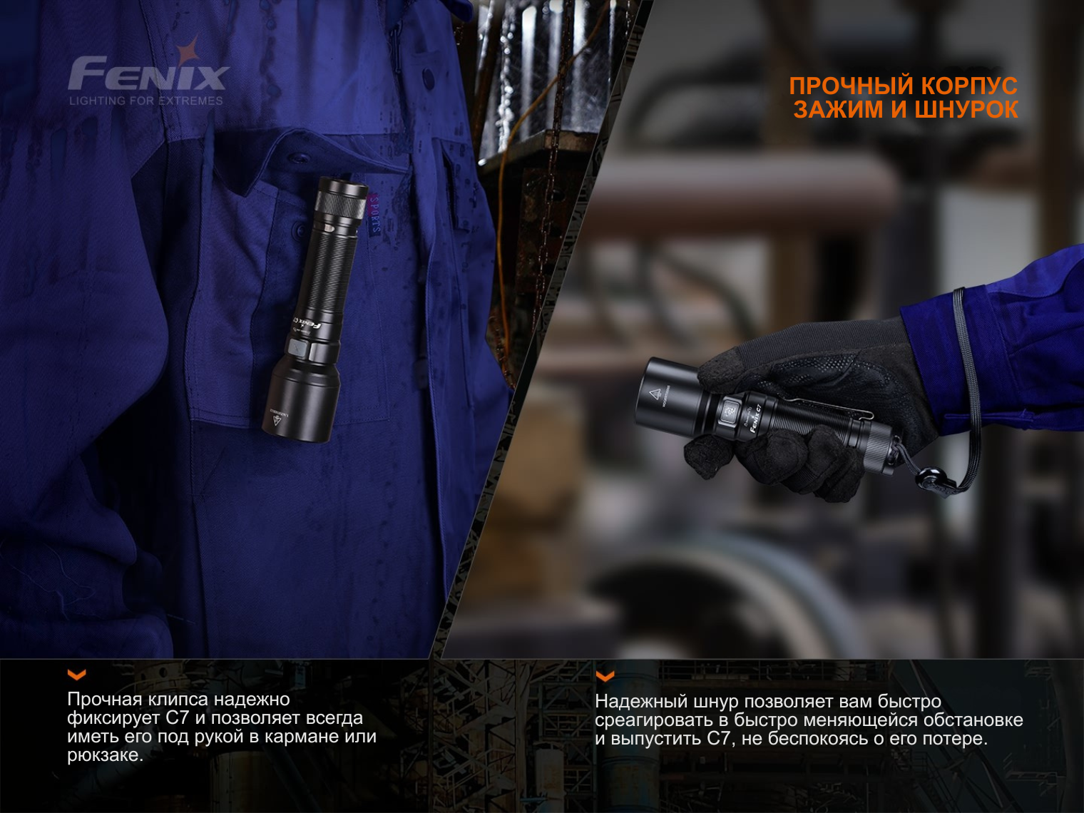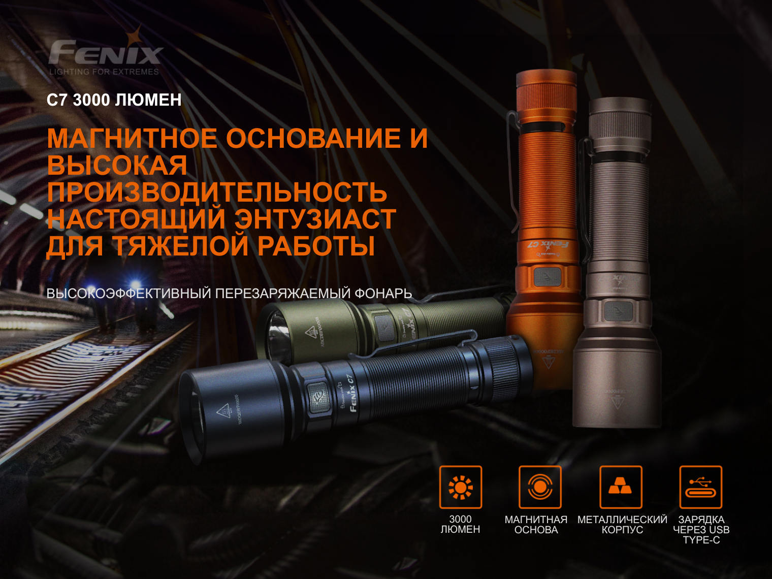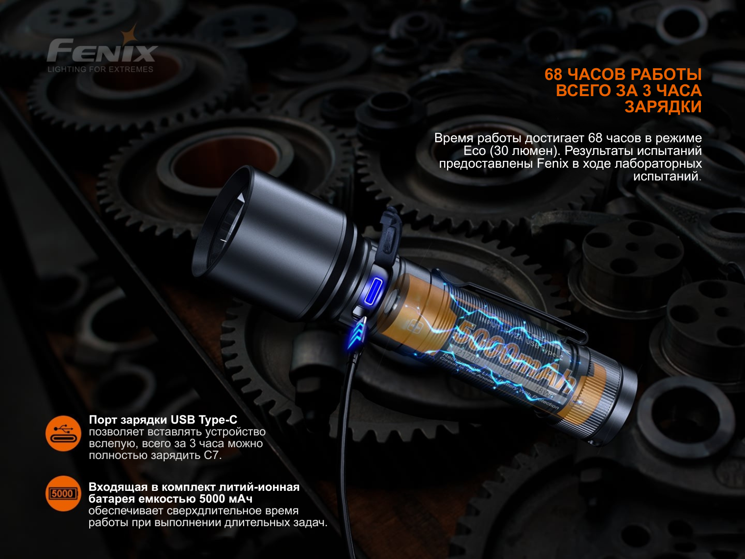 Комплектация | Fenix C7, аккумулятор ARB-L21-5000 (21700), зарядный кабель USB Type-C, темляк, запасное уплотнительное кольцо, руководство пользователя |