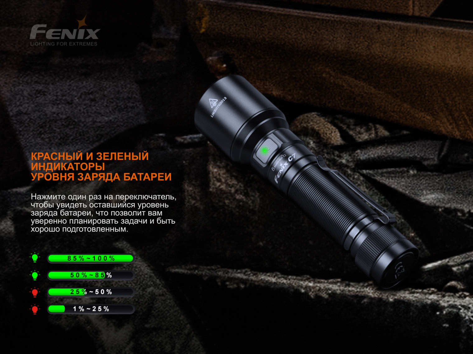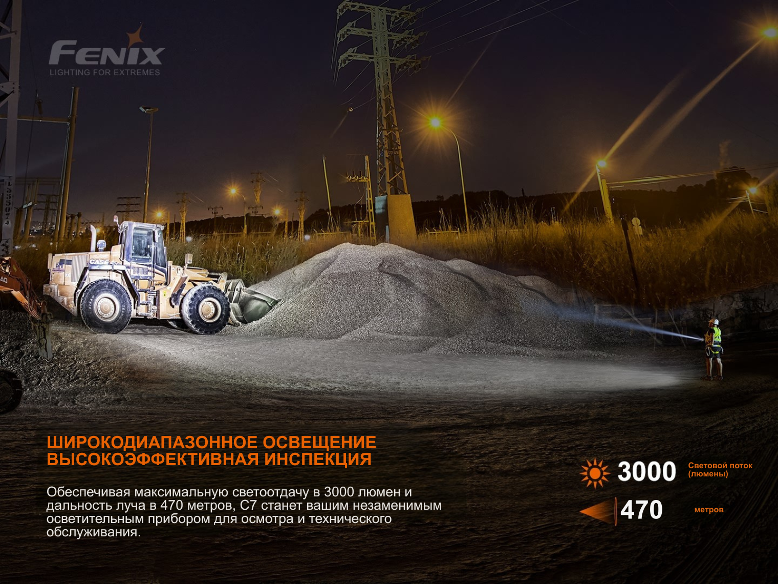 Перезаряжаемый фонарь Fenix C7 ручного формата подходит для бытовых и профессиональных целей, требующих яркого и автономного источника освещения. В основе — белый светодиод Luminus SST70 с пиковой яркостью луча до 3000 лм и дальностью 470 м. Срок службы излучателя составляет 50 тысяч часов.