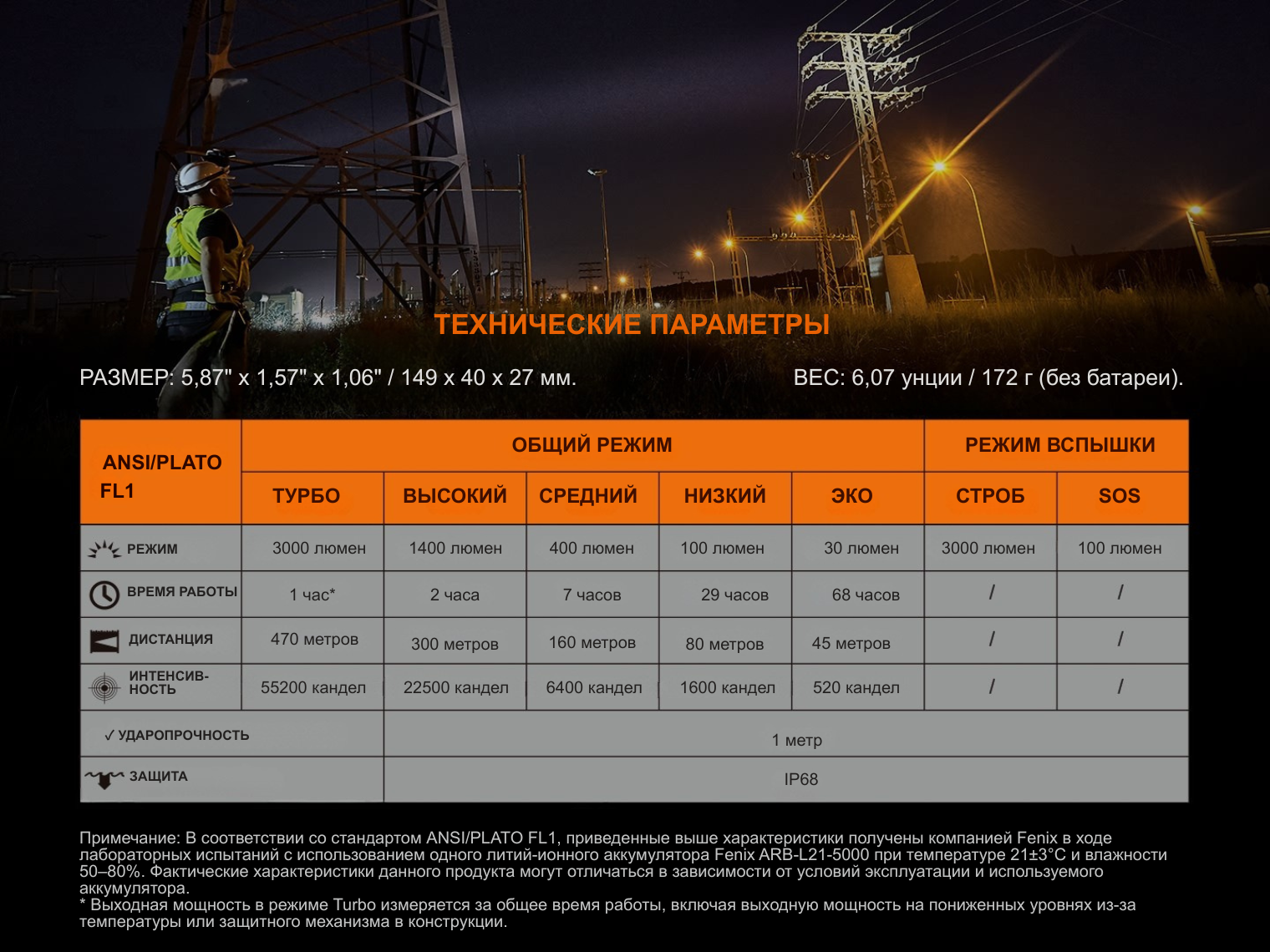 Степень защиты от воды и пыли IP68 подтверждает полную герметичность оболочки и пригодность для эксплуатации в сложных погодных условиях. Ударопрочность фонаря составляет 1 м.