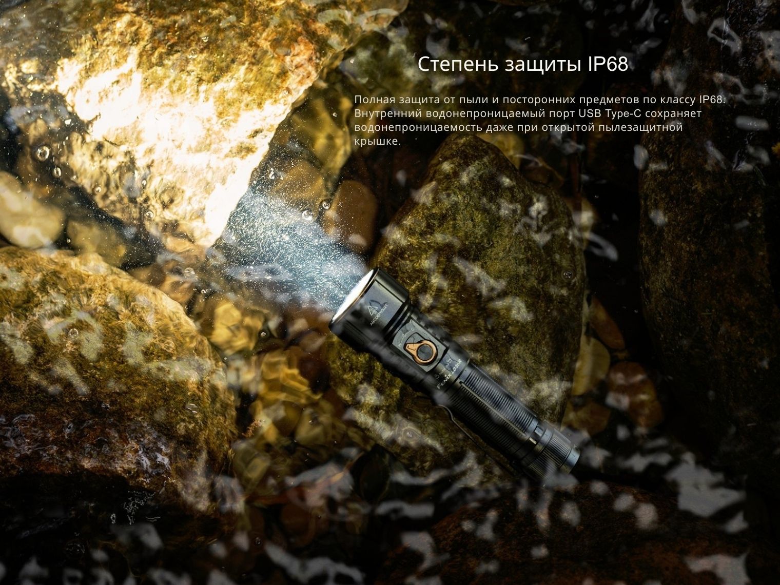Конструкция не боится падений с высоты 1 м и прямого контакта с влагой. Герметичность по стандарту IP68 гарантирует полную водонепроницаемость стыков с возможностью работы фонаря даже при погружении в воду.