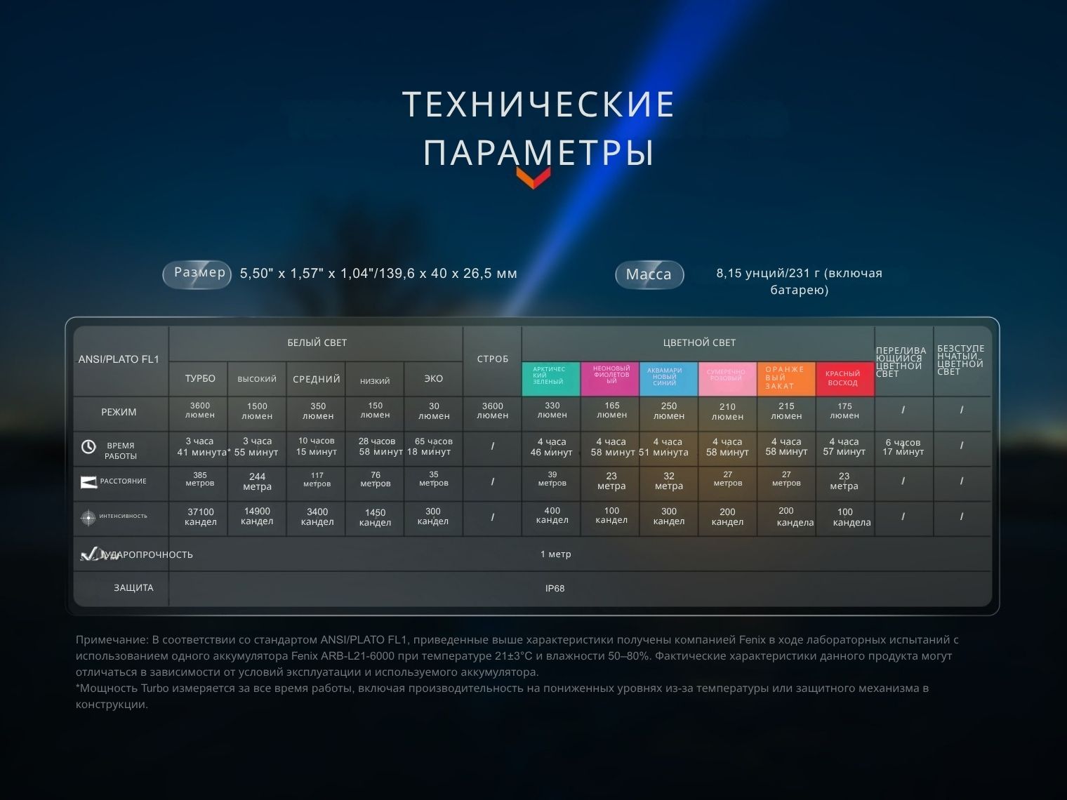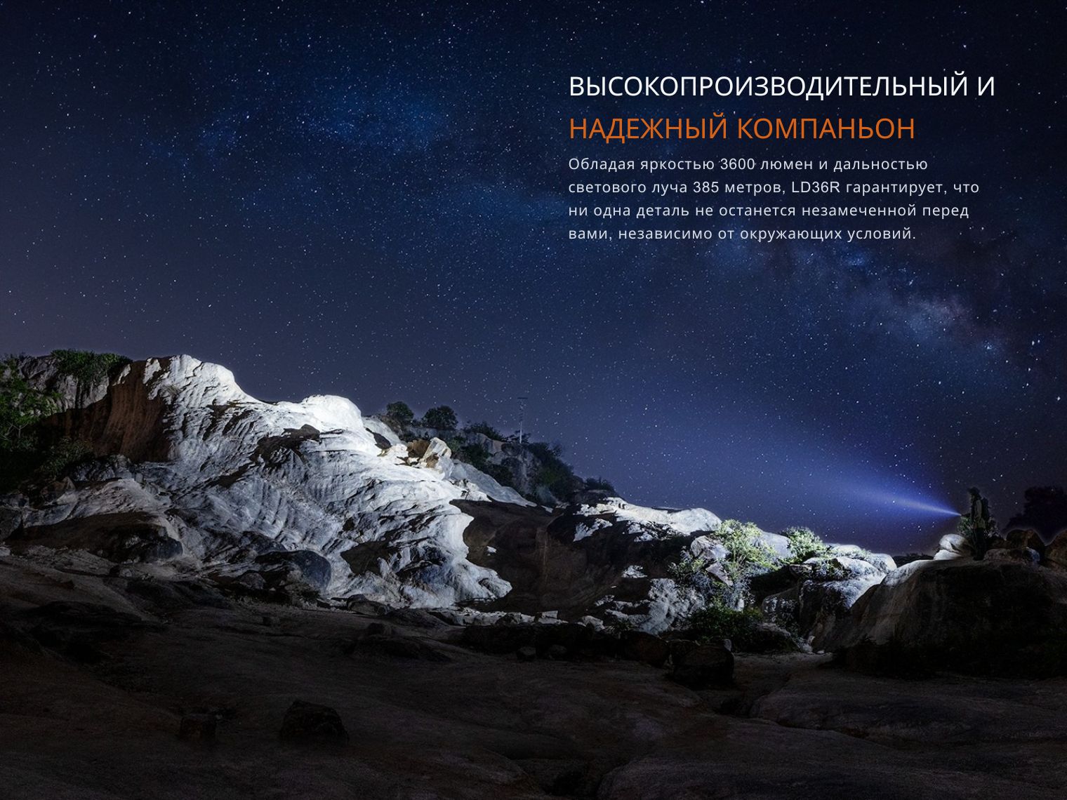 Комплектация | Fenix LD36R, аккумулятор ARB-L21-6000, зарядный кабель USB-С, диффузионный фильтр AOD-04, запасное уплотнительное кольцо, чехол, темляк, инструкция |