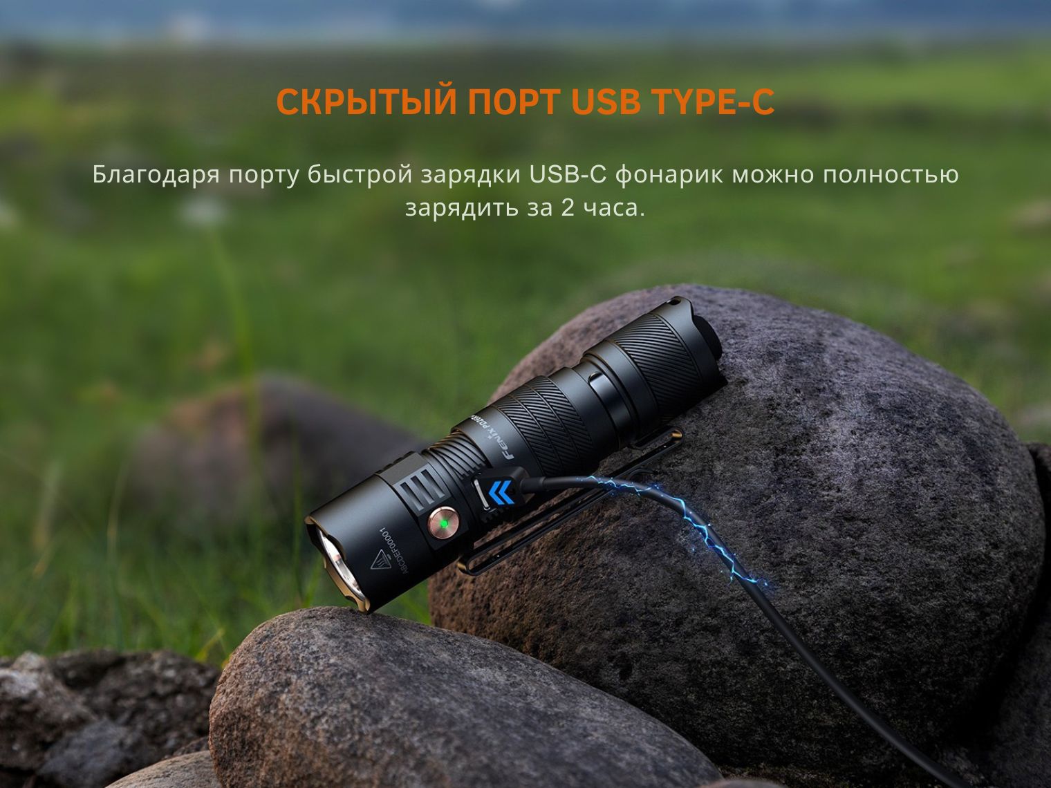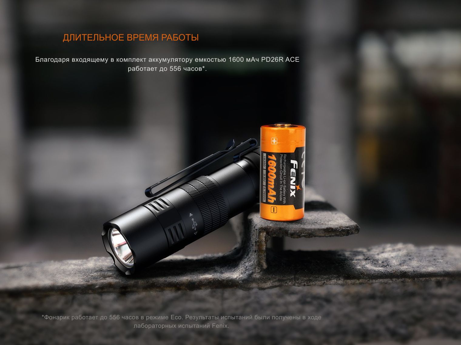 Fenix PD26R ACE питается от одного литий-ионного аккумулятора 18350 емкостью 1600 мАч, который входит в комплект. Зарядка осуществляется через скрытый порт USB-C, защищенный от влаги и пыли.