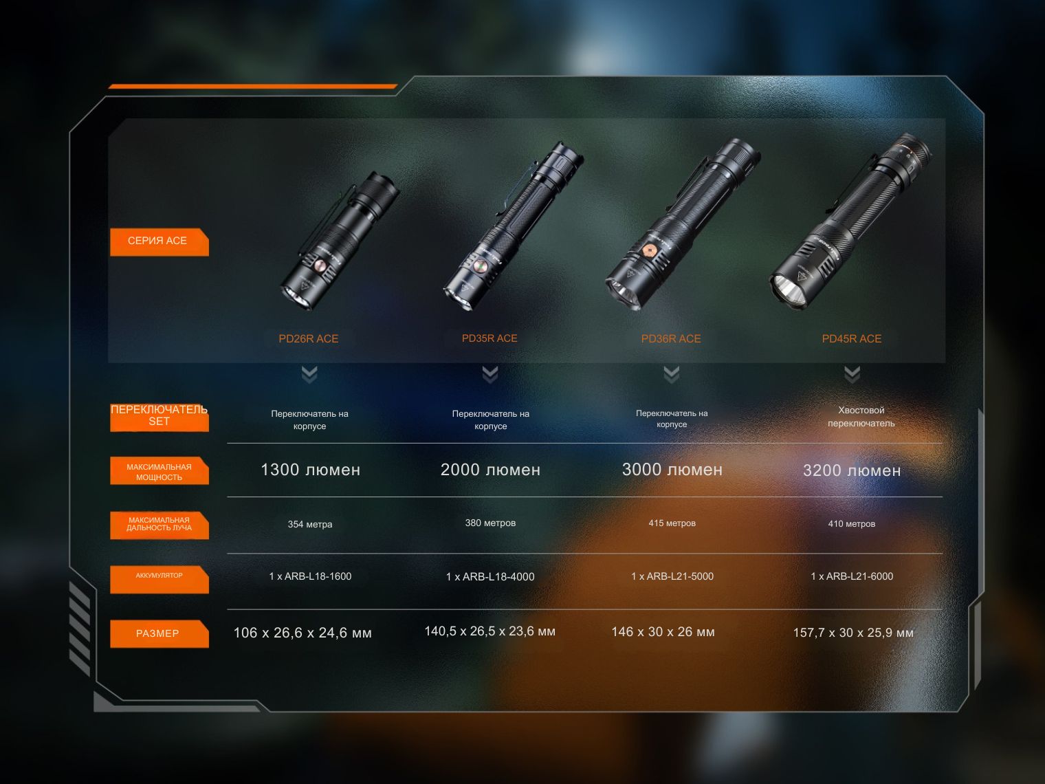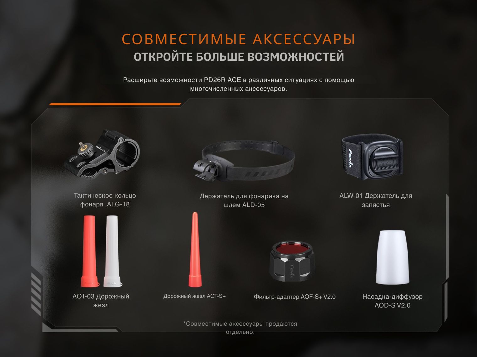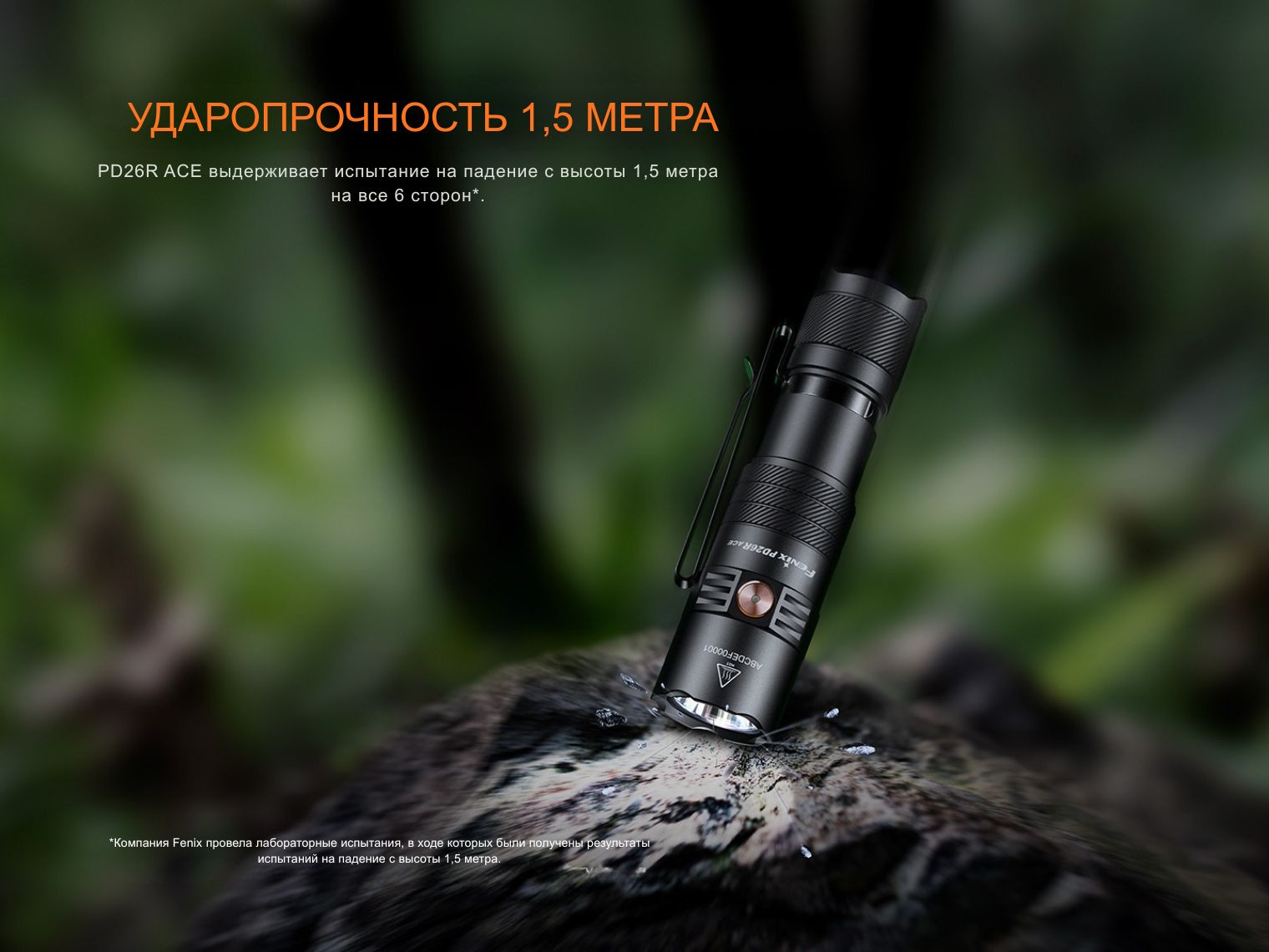 Фонарь Fenix PD26R ACE, аккумулятор 18350 на 1600 мАч (ARB-L18-1600), кабель USB Type-C, чехол, темляк, 2 запасных уплотнительных кольца, инструкция пользователя, гарантийный талон.