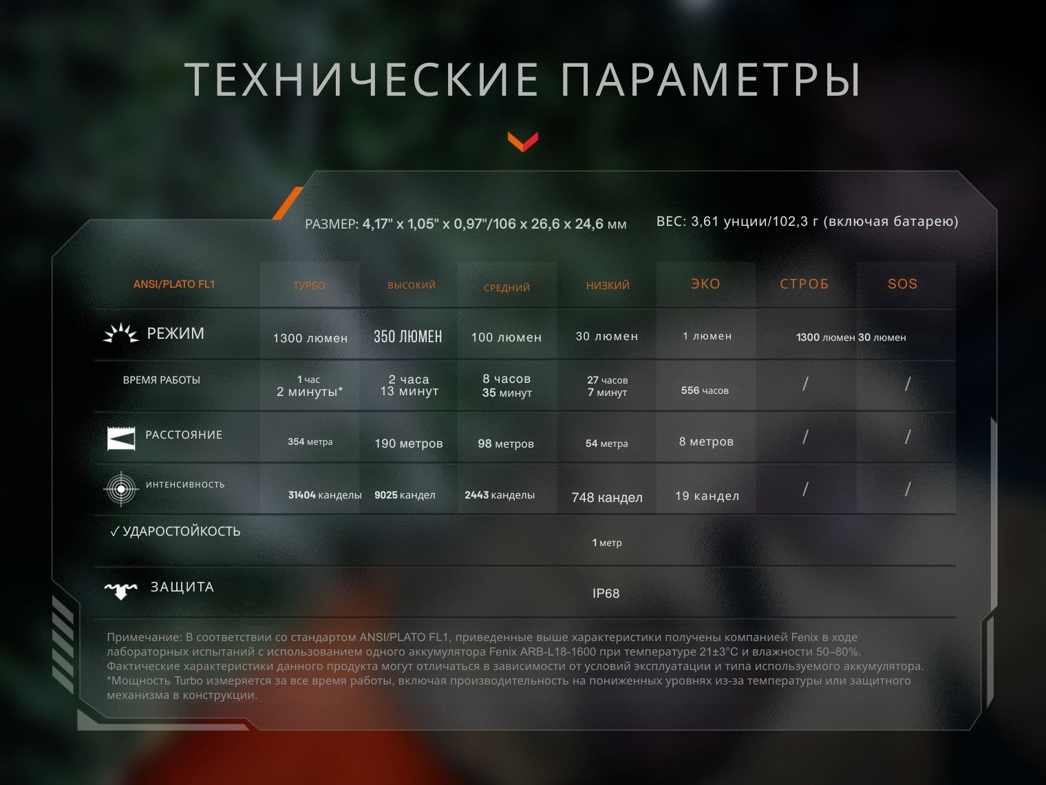 - Турбо: 1300 лм – 31404 кд – 1 ч 2 мин – 354 м;