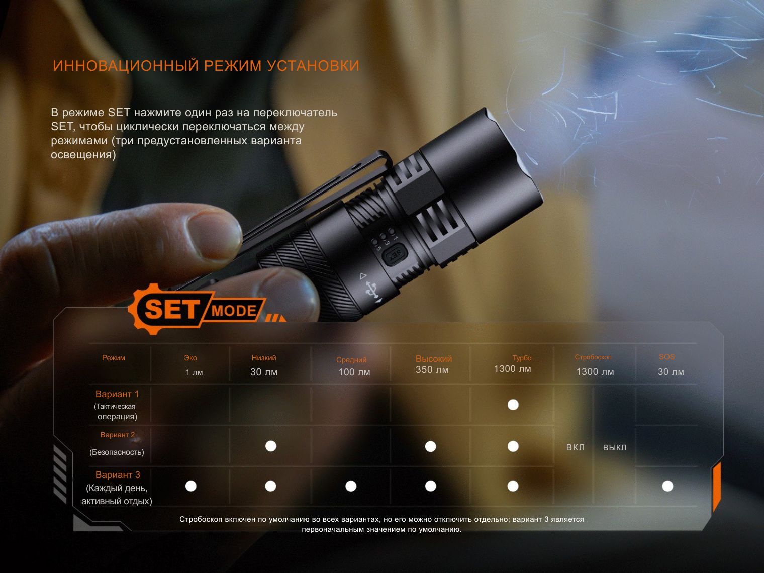 В PD26R ACE предусмотрены 7 режимов, включая несколько мигающих выходов на экстренный случай и Лунный свет для мягкой подсветки.