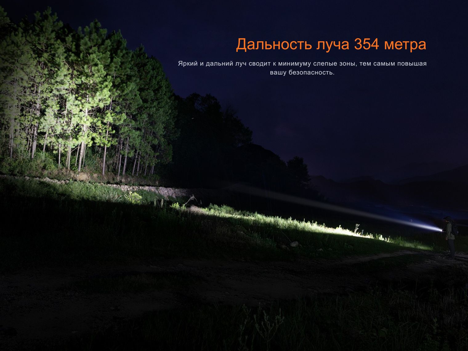 В основе оптики находится светодиод Luminus SFT25R с цветовой температурой ~6500K и закаленная ультрапрозрачная линза с просветляющим покрытием для стабильного, сфокусированного светового рисунка. Яркость света достигает 1300 люмен с дальностью 354 м, что достаточно и для городских задач, и работы на открытой местности.