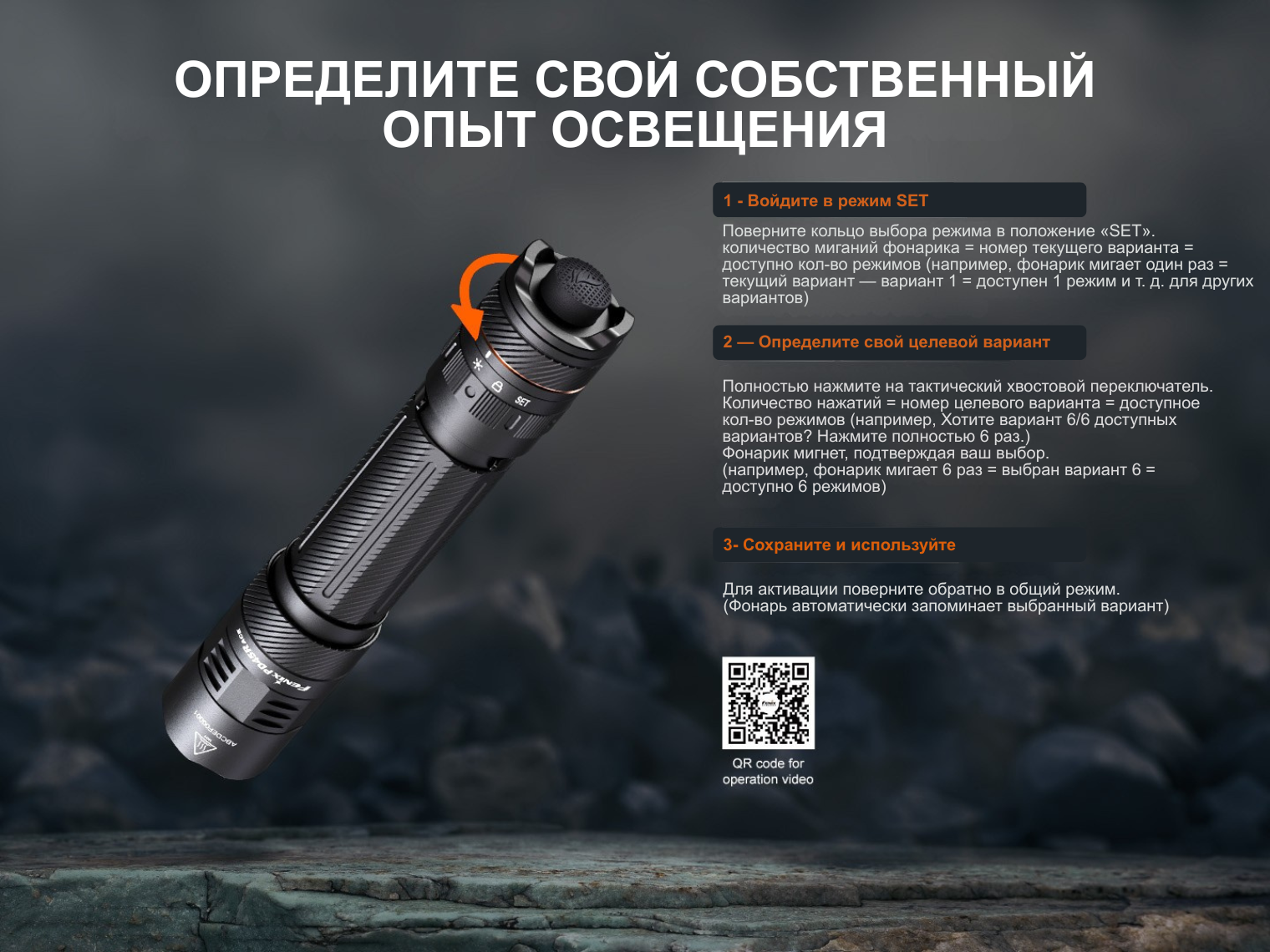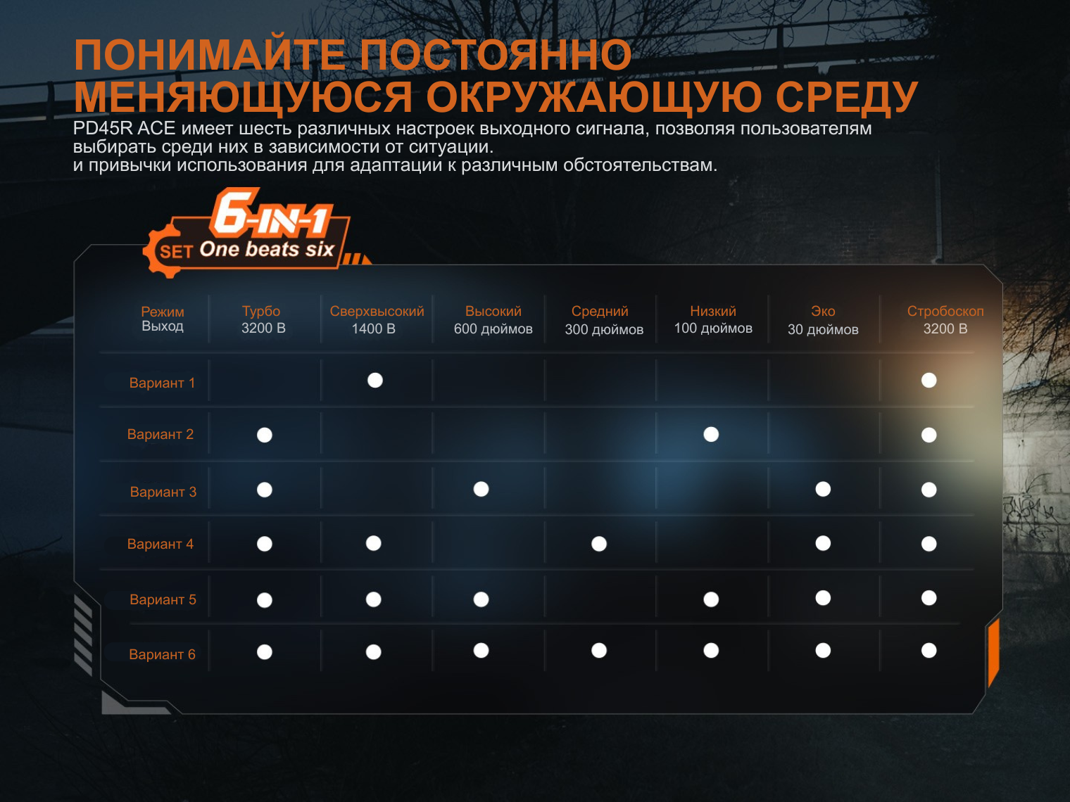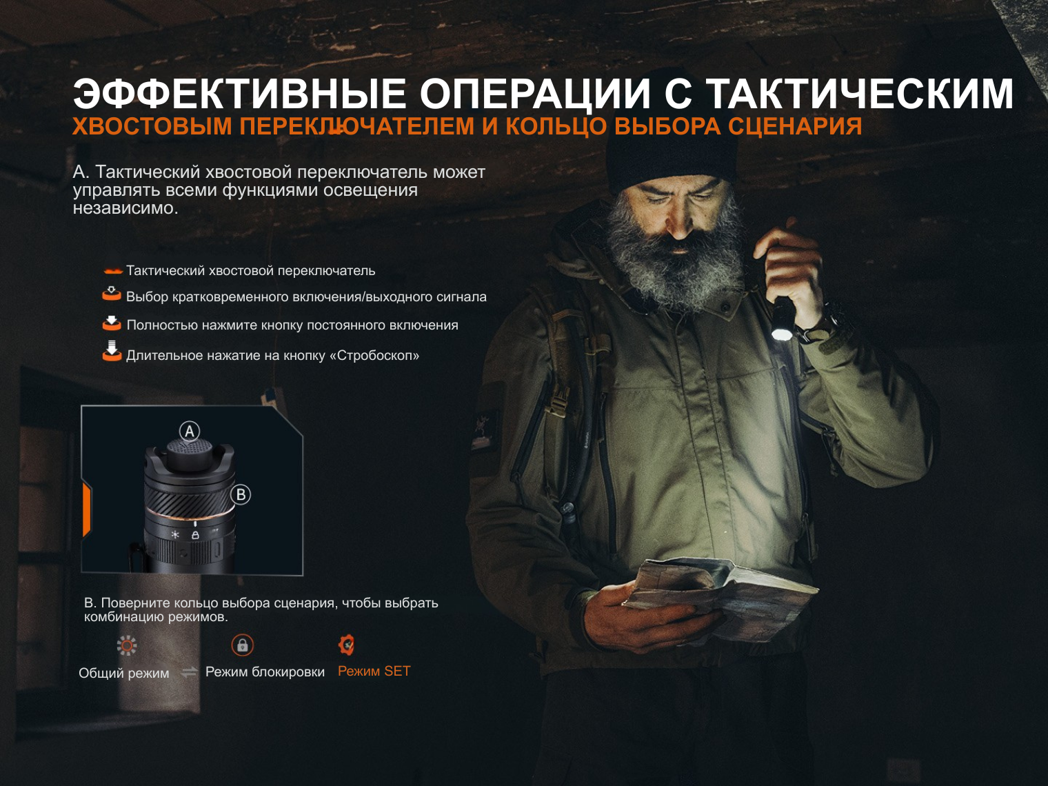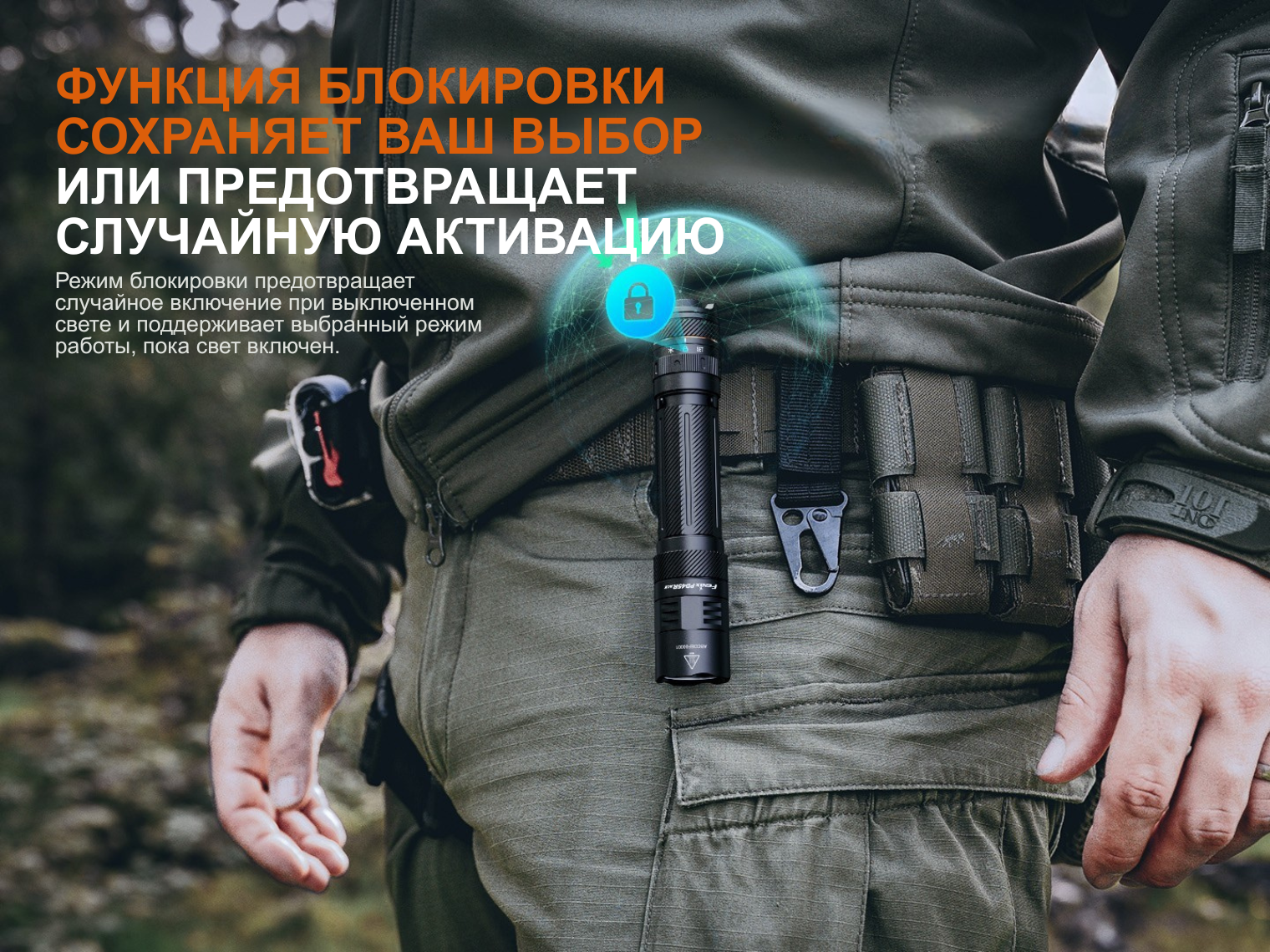 Главная особенность Fenix PD45R ACE — поворотное кольцо SET. Вы сами выбираете один из шести предустановленных наборов режимов, который подходит под ваши цели. Также есть функция блокировки луча (Lock), которая не только предотвращает случайное включение устройства, но и фиксирует уже активированный свет.
