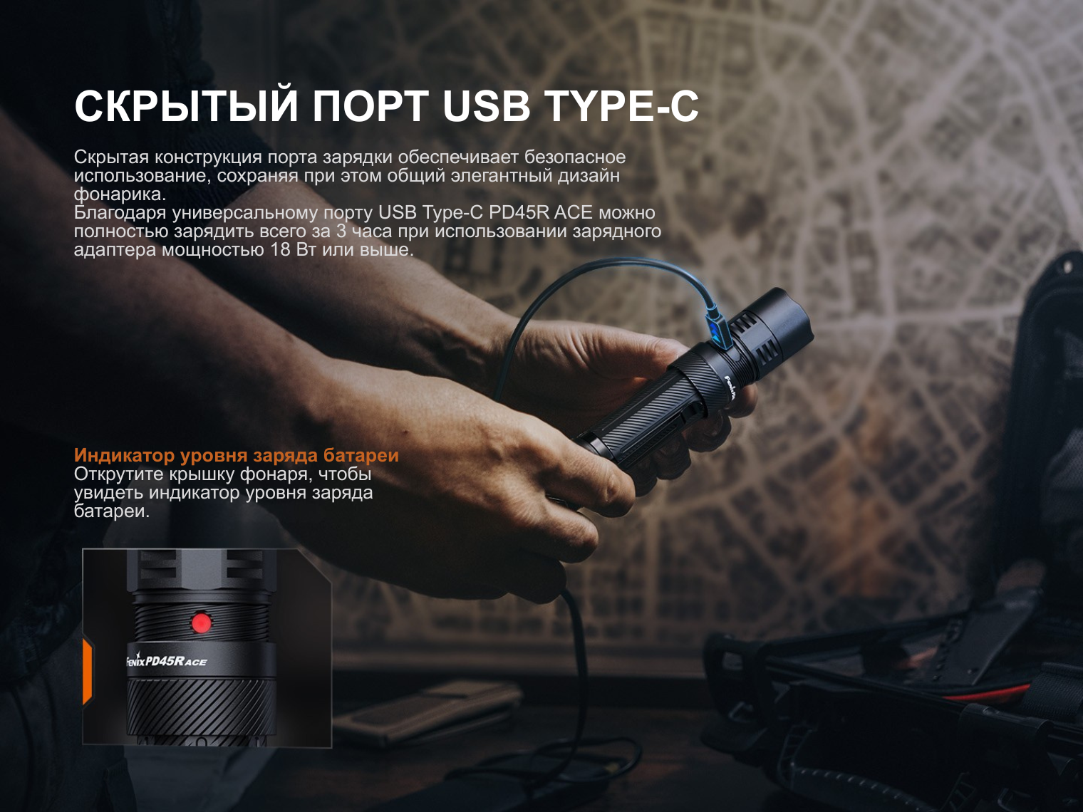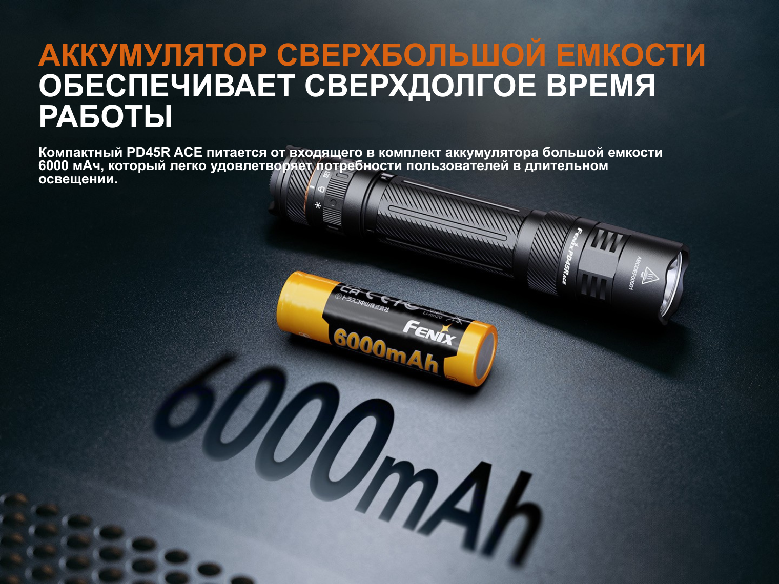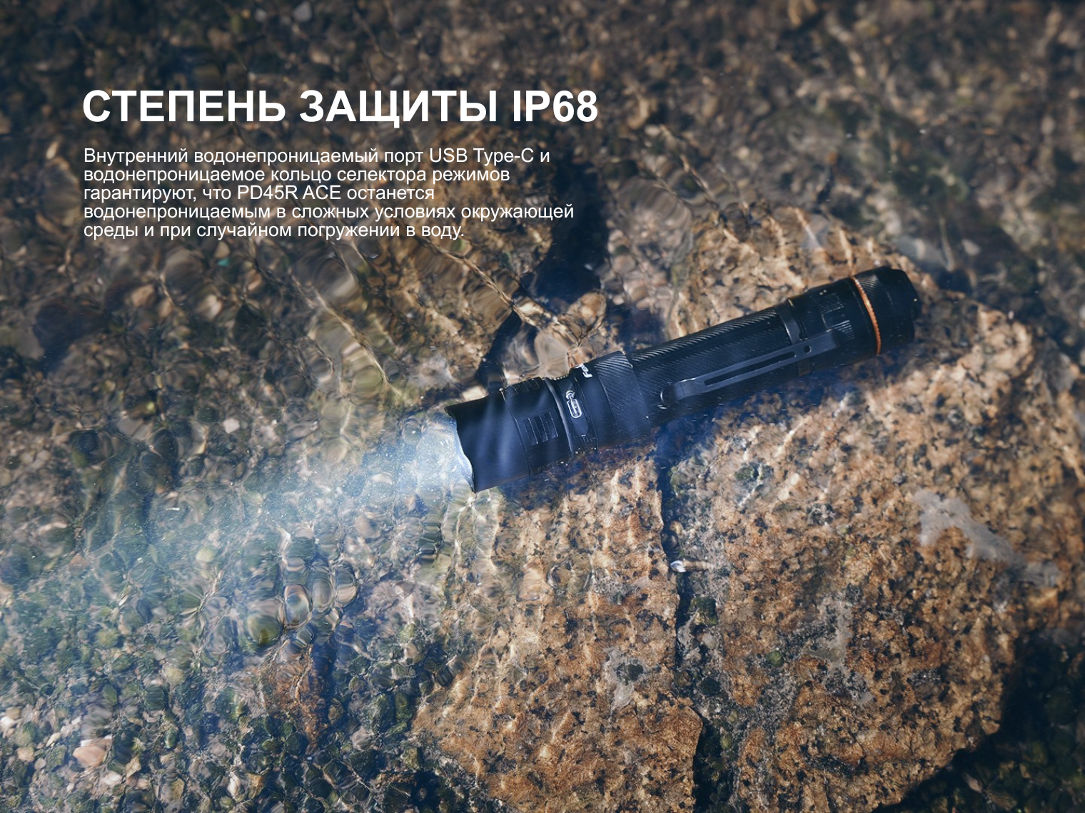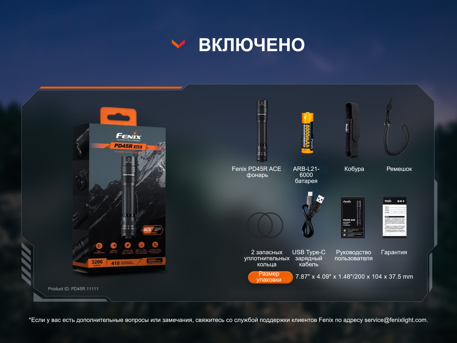 Комплектация | Fenix PD45R ACE, аккумулятор ARB-L21-6000, чехол, темляк, 2 х запасных уплотнительных кольца, зарядный кабель USB-C, инструкция |