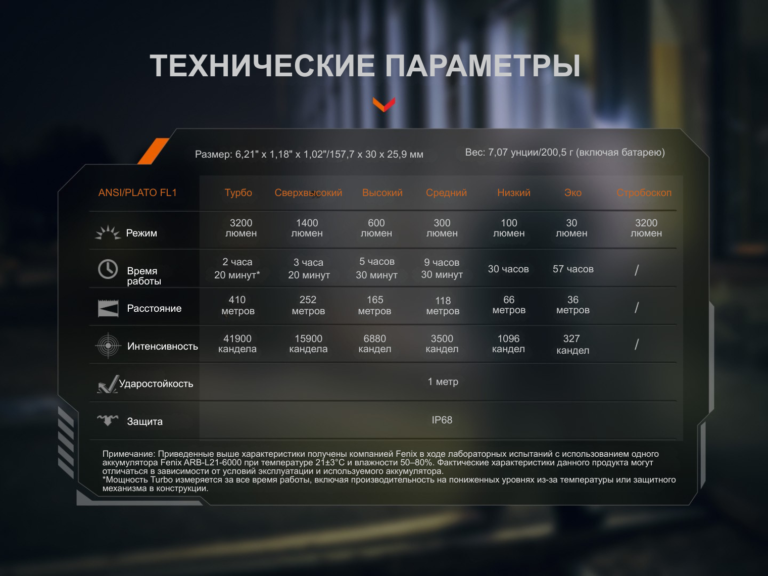Обратите внимание! В фонаре предусмотрена защита от перегрева, которая автоматически снижает яркость луча, если внутренняя электроника нагревается до 60°C. Время работы в режиме Turbo указано с учетом срабатывания защитной системы.