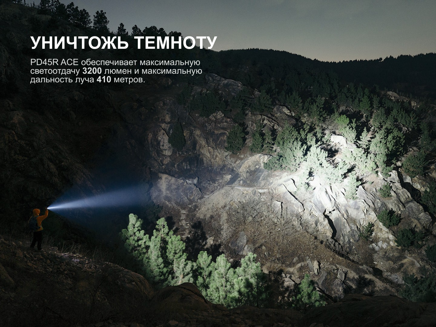 - Turbo: 3200 лм – 41900 кд – 2 ч 20 мин – 410 м;