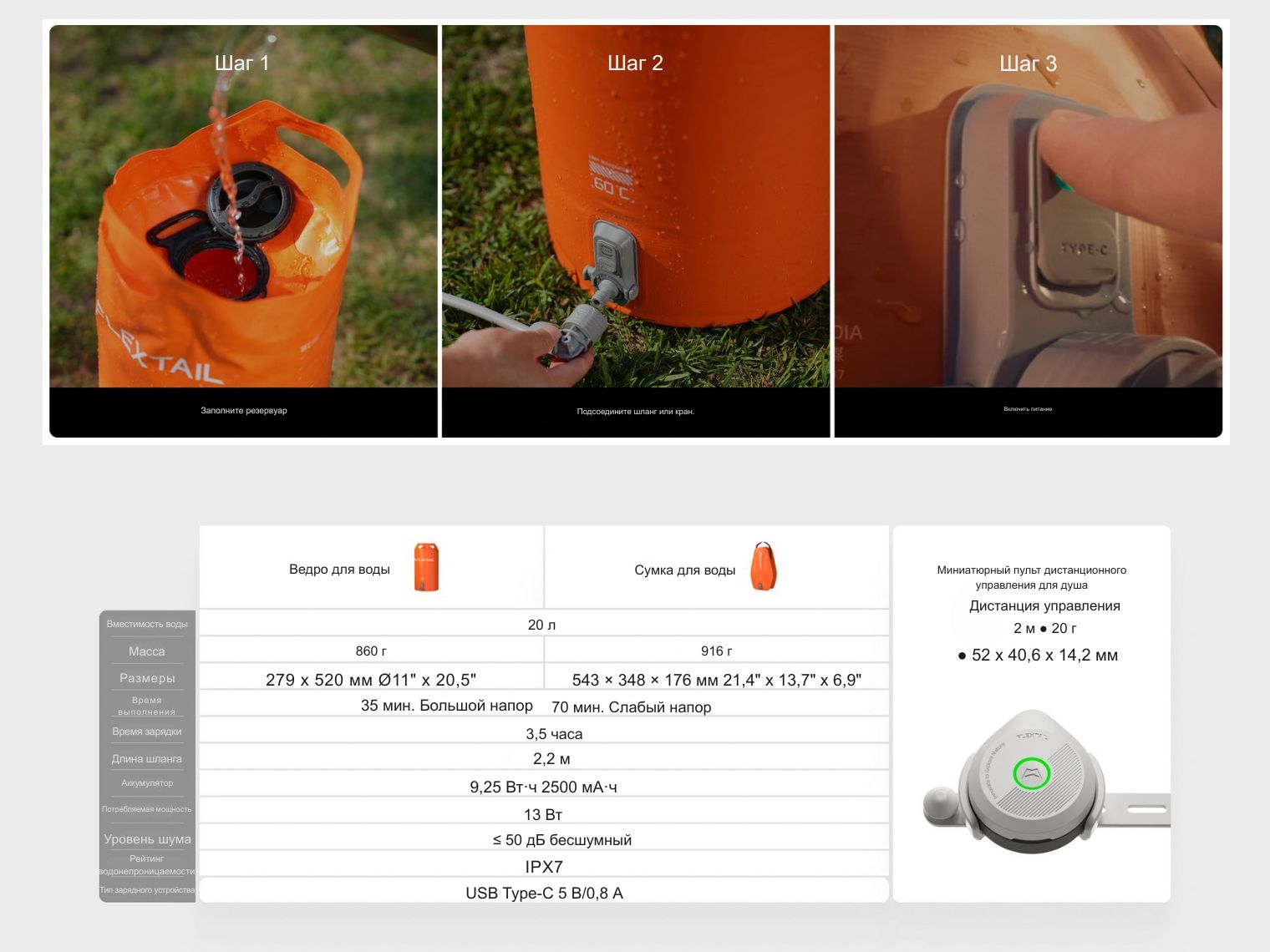 Контейнер Flextail Tiny Shower Bucket имеет полноценную переносную систему водоснабжения с душем. Конструкция оснащена электрическим насосом, который обеспечивает мощный поток воды без необходимости использования дополнительных аксессуаров и подключения к внешним источникам сети. Все, что нужно: наполнить контейнер водой и нажать кнопку включения.