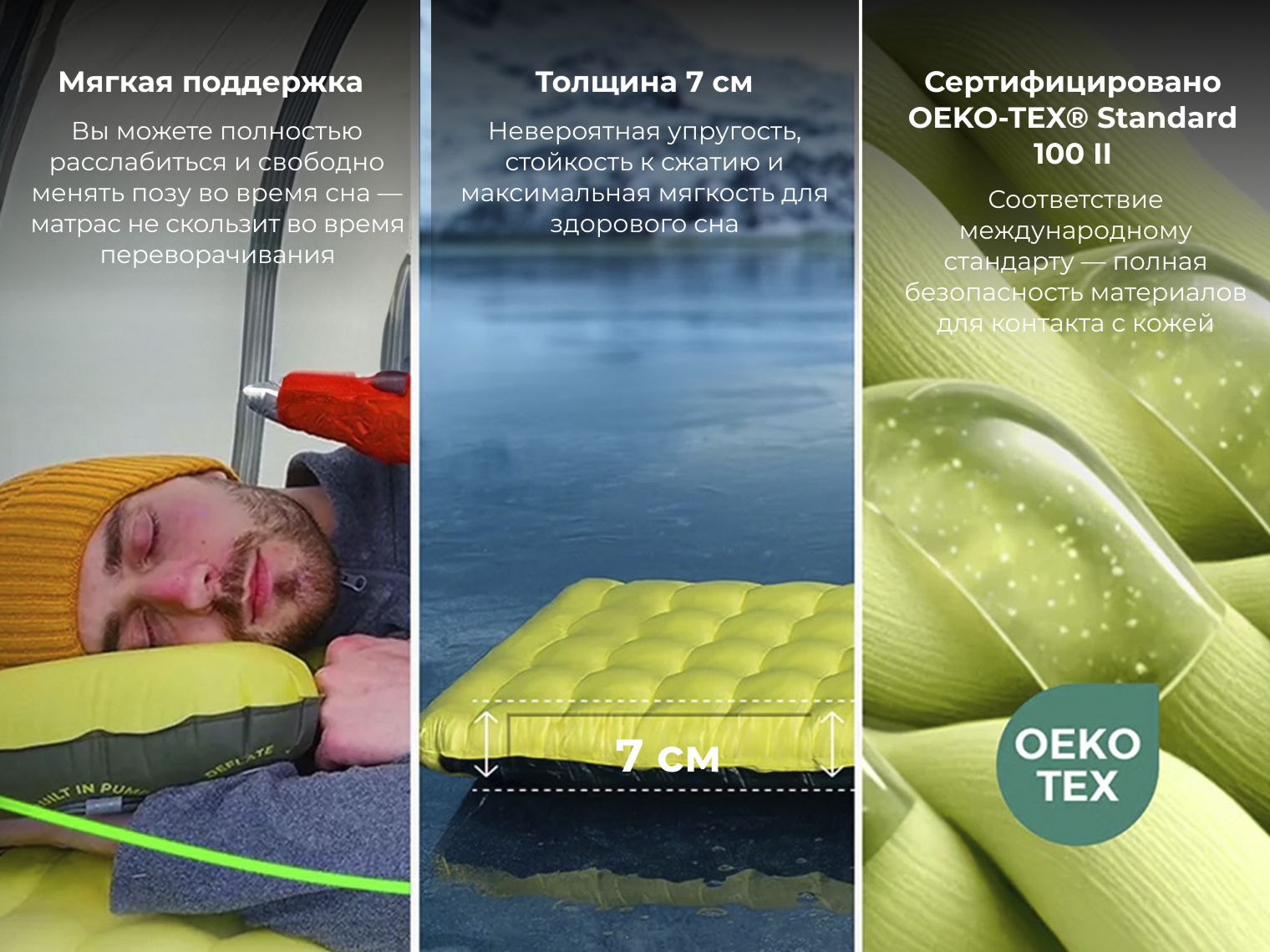 Толщина 7 см (2.7 дюйма) и специальная конструкция ячеек нивелируют неровности рельефа, предотвращая скольжение и обеспечивая мягкую поддержку позвоночника.
