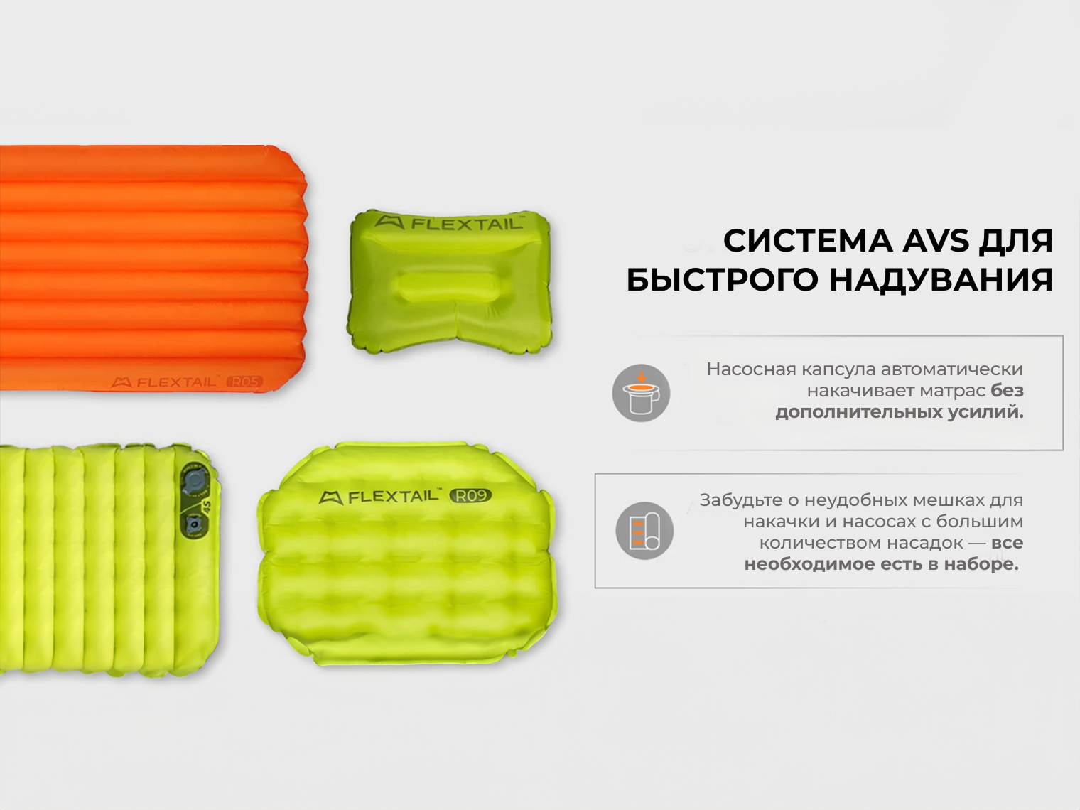 Описание матраса туристического самонадувающегося Flextail R05 AVS Mummy сверхлегкого, 183х65х7 см с насосной капсулой AVS, оранжевого:
