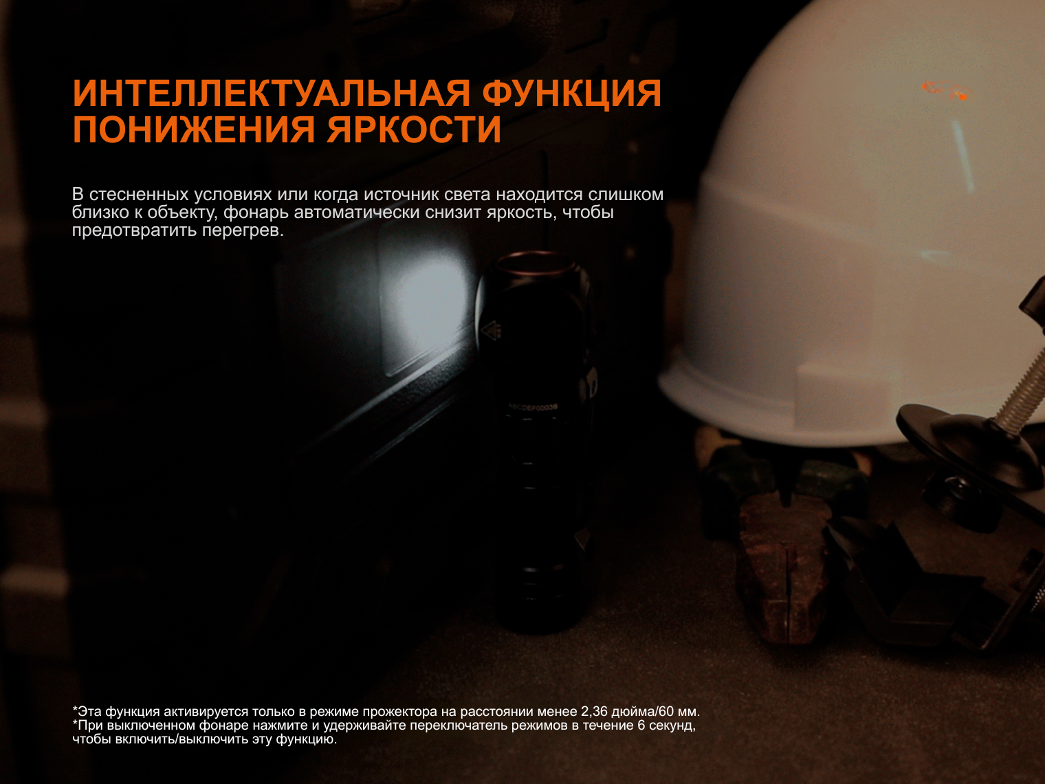 Обратите внимание! Время работы в режиме Турбо измерено с учетом уровней с меньшей яркостью. Фонарь переходит на них при сильном нагреве или если сработал сенсор приближения к объекту.