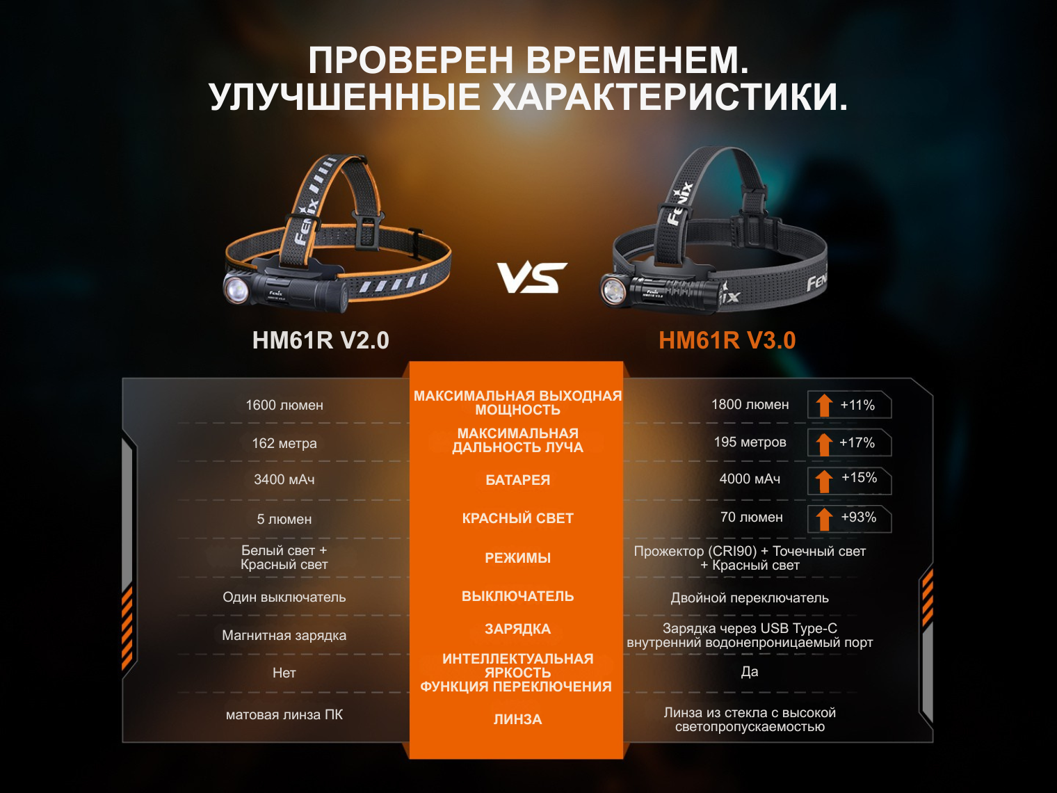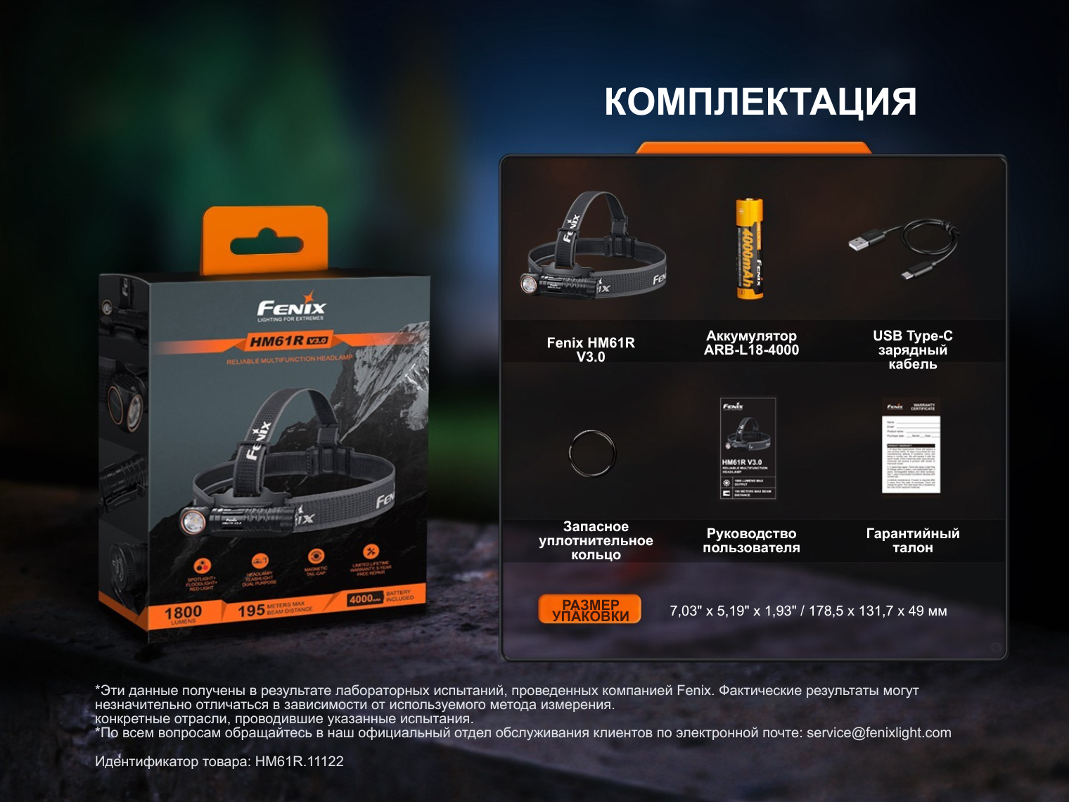 Фонарь Fenix HM61R V3.0, аккумулятор ARB-L18-4000, налобное крепление (холдер и ремешок), зарядный кабель USB Type-C, запасное уплотнительное кольцо, инструкция пользователя, гарантийный талон.