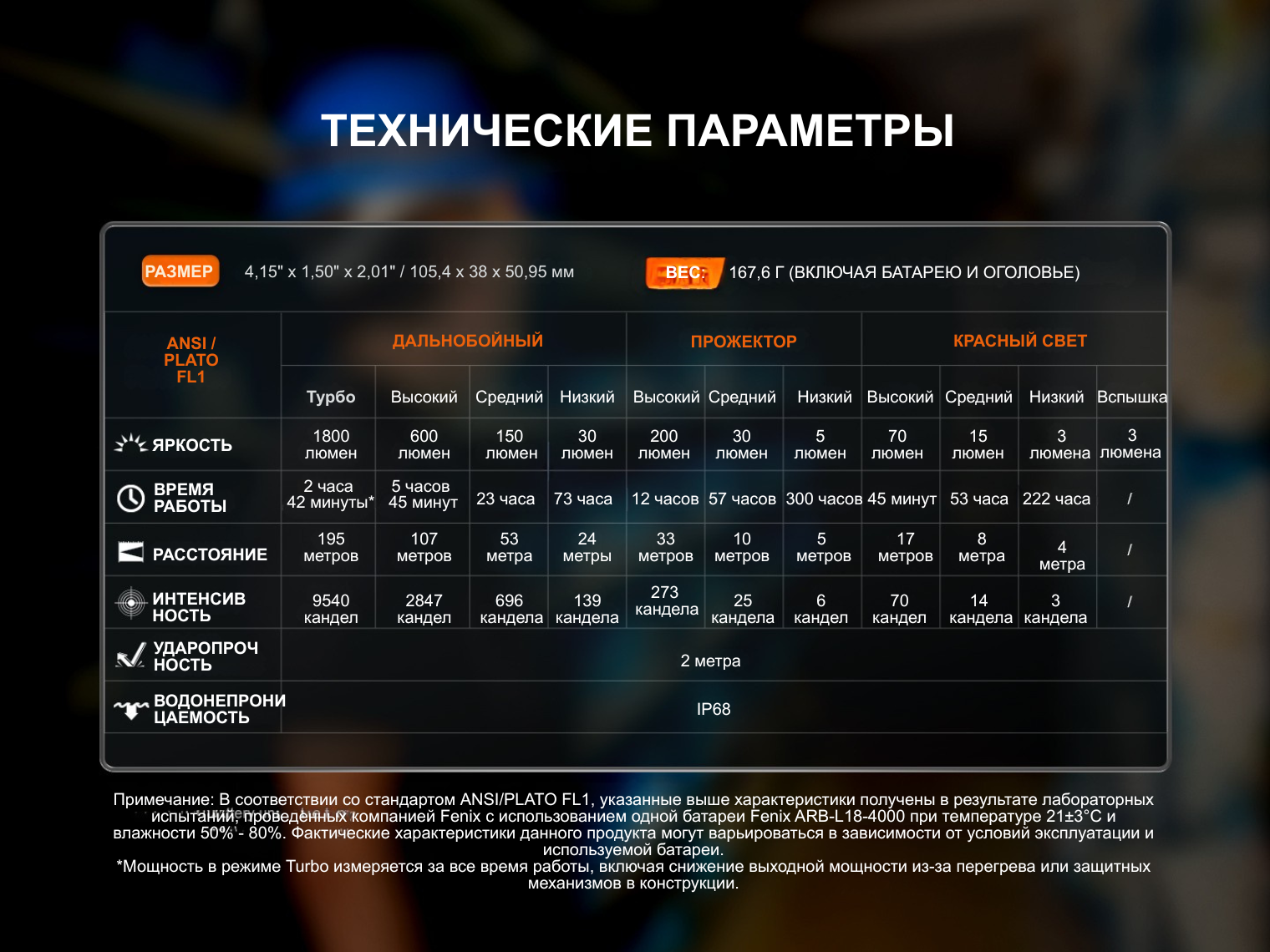 - Турбо: 1800 лм – 9540 кд – 2 ч 42 мин – 195 м;