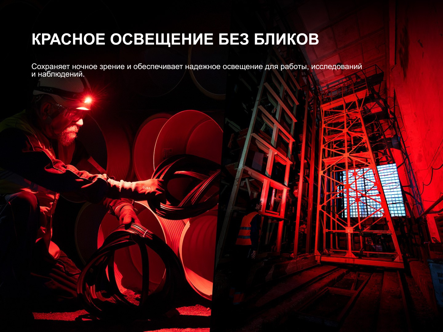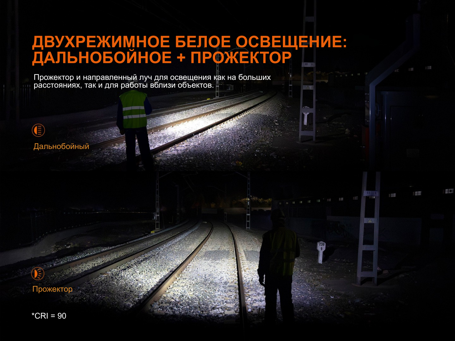 Основной светодиод Luminus SST40-GEN2 выдает холодный белый свет (6500K) и рассчитан на дистанцию до 195 м. Для работы с документами или вблизи добавлен диод OSRAM 1414 CRI90, который дает нейтральный рассеянный свет без искажения цветов. Отдельный красный диод OSRAM 1414 яркостью до 70 люмен позволяет сохранить ночное зрение или работать в режиме сигнального маяка.
