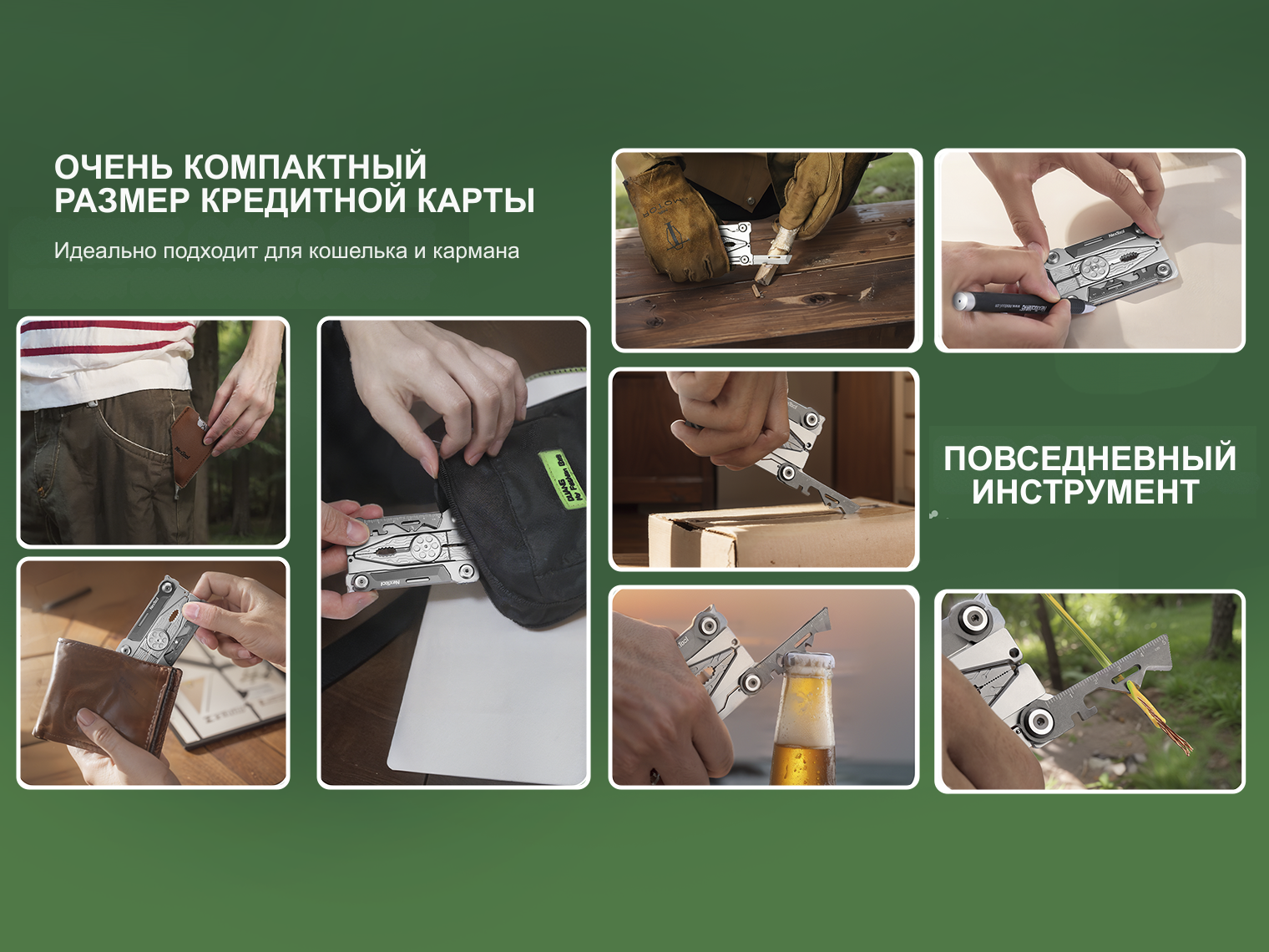 Конструкция размером с банковскую карту вмещает полноценный набор инструментов с разными функциями — от реза и работы с крепежами до экспресс-ремонта во время путешествий.