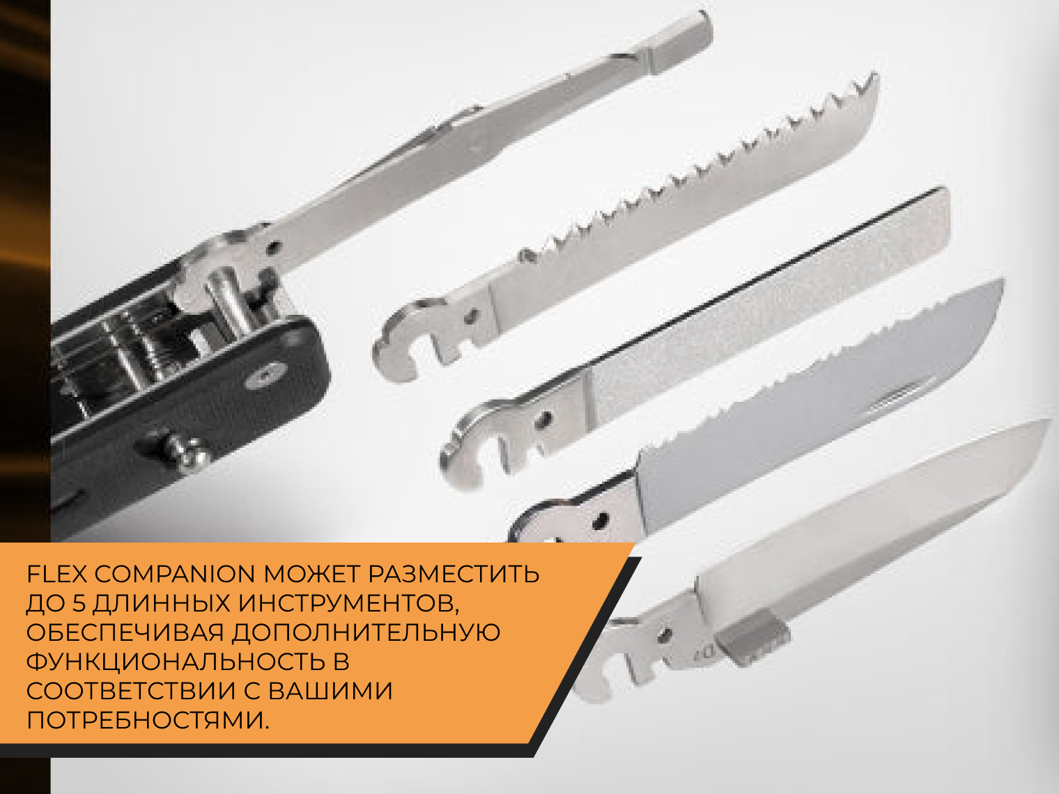 Мультитул Roxon Flex Companion S503G имеет уникальную особенность — модульную конструкцию. Вы можете собирать индивидуальный набор инструментов под собственные задачи: для города, велопоездки, ремонтных работ, кемпинга и рыбалки. При этом в дизайне сохранена компактность, привычная для мультитулов карманного формата — всего 9 х 2.3 х 2.2 см в закрытом положении.