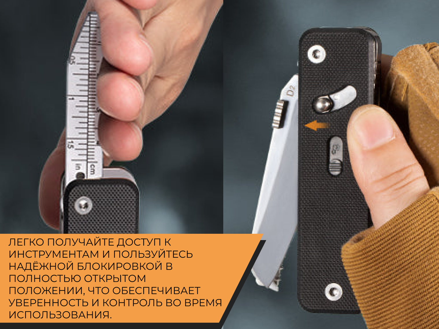 Инструменты фиксируются при полном раскрытии, предотвращая самопроизвольное закрытие элемент во время использования. Основной нож можно открывать одной рукой с помощью шпенька под большой палец сбоку клинка.