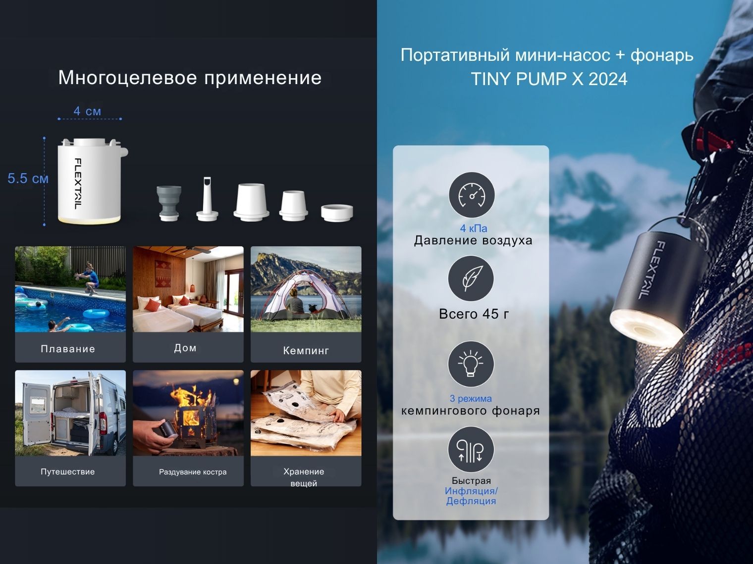 Flextail Tiny Pump X — это функциональное устройство 3-в-1 для накачивания и сдувания изделий, а также мягкого освещения небольшого пространства.