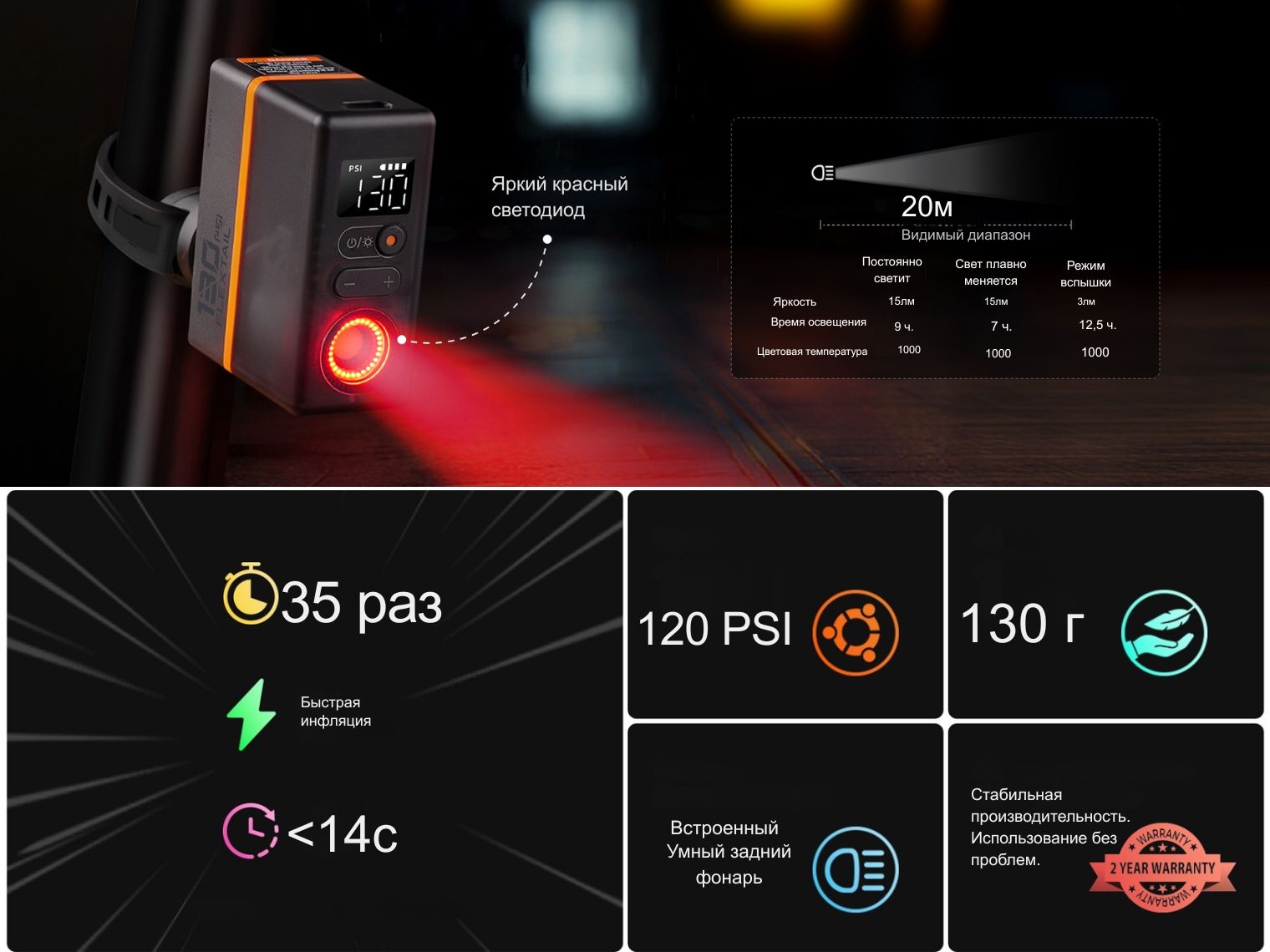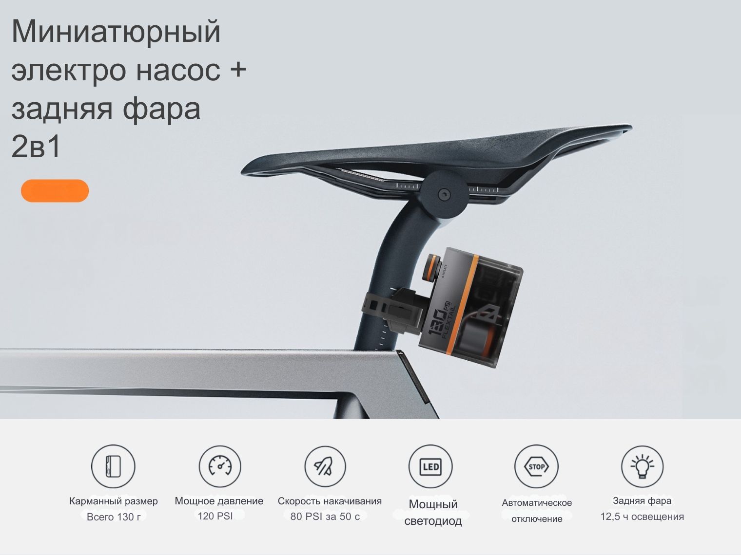 Корпус карманного формата (52 х 29 х 67 мм, 130 г) объединяет насос с давлением до 120 PSI и интегрированным задним светом с автоматическим отключением при достижении заданного давления. В основе находится система центробежного охлаждения ACS для отвода тепла при нагрузке, а использование бесщеточного мотора и короткоходного поршня повышает эффективность эксплуатации.