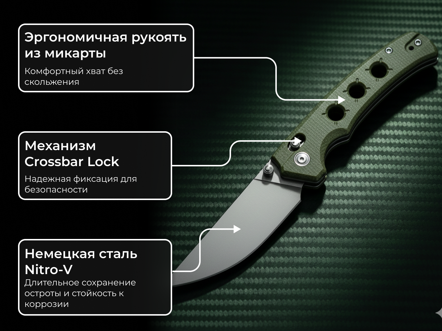 - материал клинка — сталь Nitro-V (твердость 59–61 HRC);