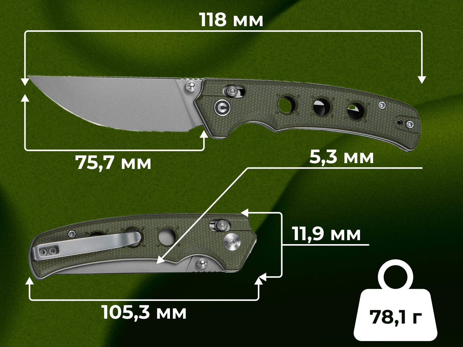 - длина ножа — общая 181 мм, в сложенном виде 105 мм;
