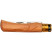 Клинок профиля Clip Point изготавливается из нержавеющей стали Aisi 420 или углеродистой стали C70, в зависимости от модели. Эти типы стали идеально подходят для такого типа ножей и легко правятся даже в полевых условиях. В рабочее положение клинок приводится ногтевой выемкой и фиксируется поворотом специального кольца в передней части рукояти. Сам производитель называю эту систему «Brass with locking», что является производным от замка Virobloc. На клинок нанесен вытравленный солью логотип «Old Bear».