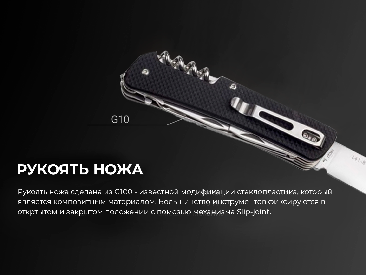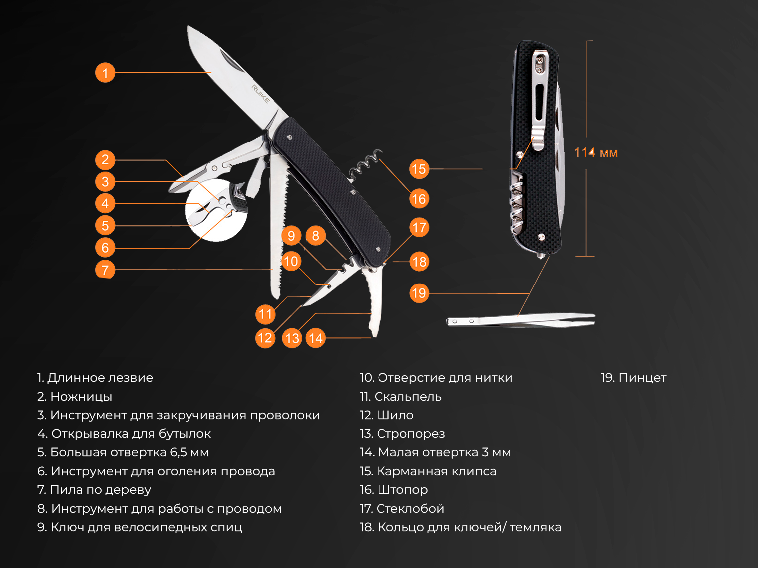 Не менее важную функцию чем нож, играют и остальные инструменты, встроенные в Ruike L42. В нижней части рукоятки размещены пила по дереву, уменьшенные в размере ножницы, шило, две прямые отвертки (малая и средняя), стропорез, открывалку для бутылок, инструмент, зачищающий провода от изоляции. С обратной стороны рукоятки можно достать штопор. Еще два инструмента помещены со стороны торца – это стеклобой и небольшой кольцо для подвешивания к ножу темляка.