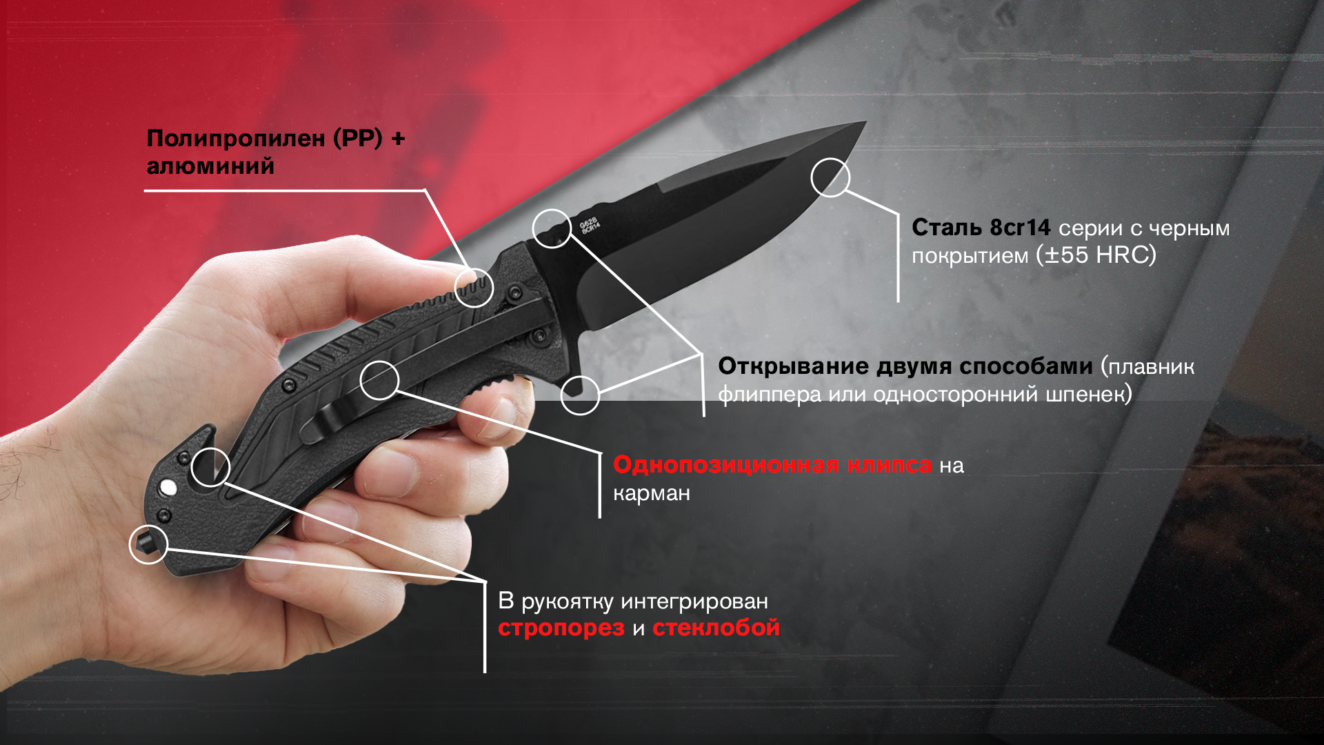 Необычный дизайн — это первое, что привлекает внимание при взгляде на нож Ganzo G628. Складной клинок имеет черное покрытие в тон рукояти, привнося некоторую брутальность в общий вид инструмента. При этом модель не лишена практичности благодаря наличию в конструкции не только острого лезвия, но и нескольких функциональных дополнений в виде стропореза и стеклобоя на рукояти, которые делают из ножа идеального спутника для туристических путешествий.