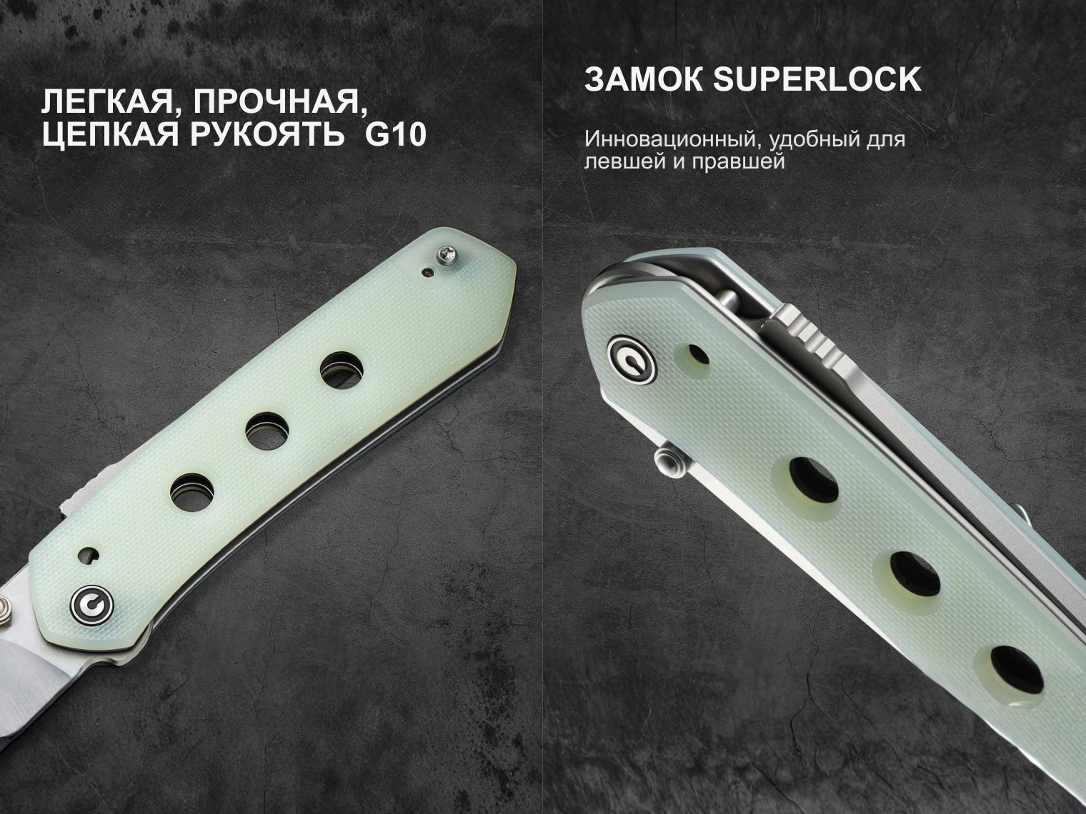 В качестве замка используется механизм Superlock, разработанный брендом в сотрудничестве с дизайнером Snecx Tan. Стальной запирающий стержень при легком давлении разблокирует клинок и позволяет мгновенно прятать его в рукоять. Конструкция симметрична и удобна для правшей и левшей.