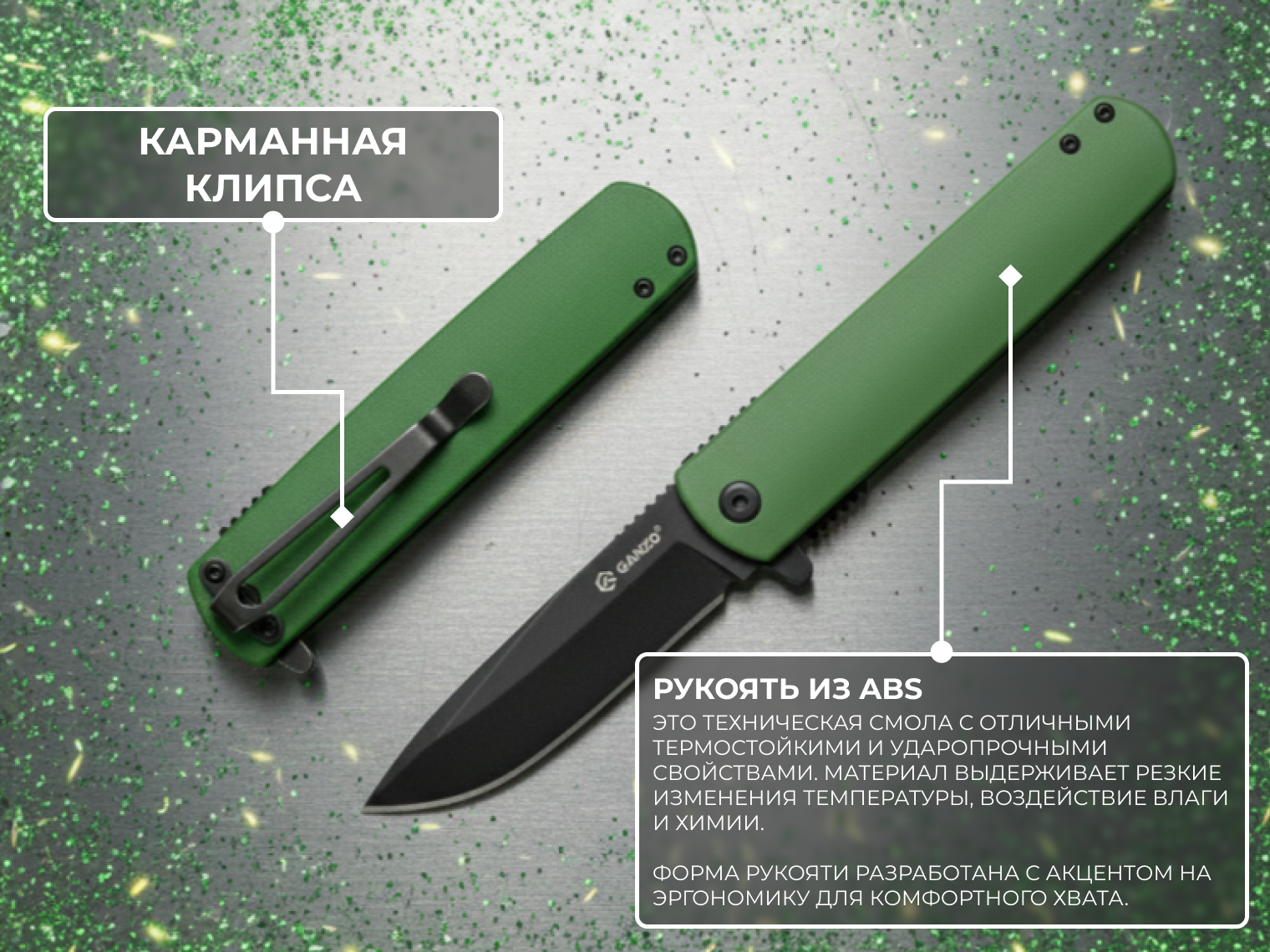 Модель Ganzo G626-GR ориентирована на ежедневное использование в городе и выезды на природу. Главная особенность ножа — клинок Tanto длиной 96 мм с двумя режущими кромками, сходящимися под углом. Толстое острие выдерживает сильные нагрузки, поэтому кончик не сломается даже при пробивании пластика или толстого картона.